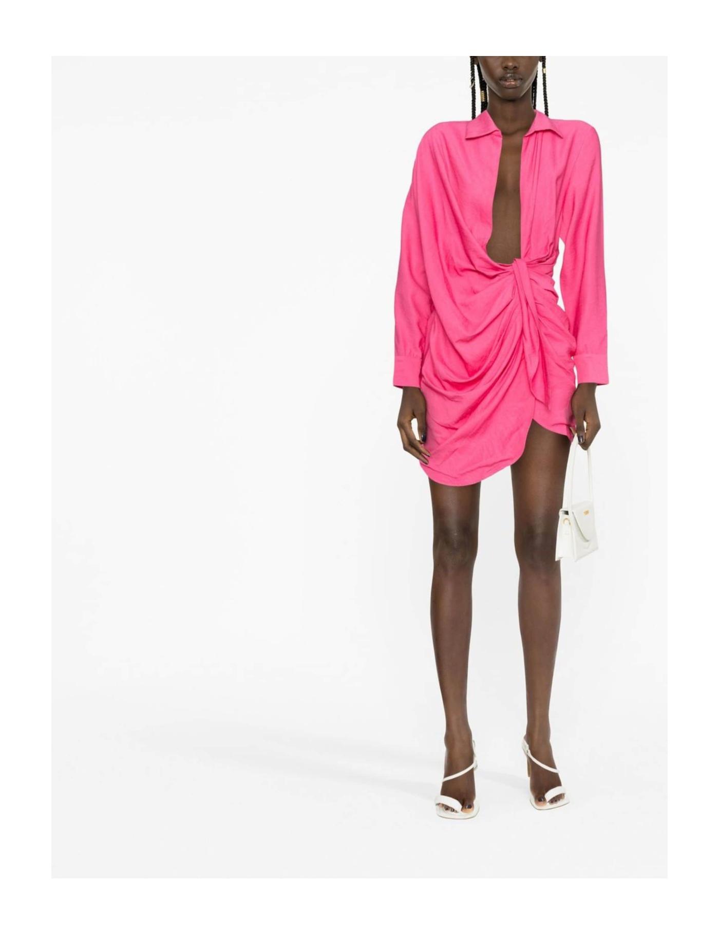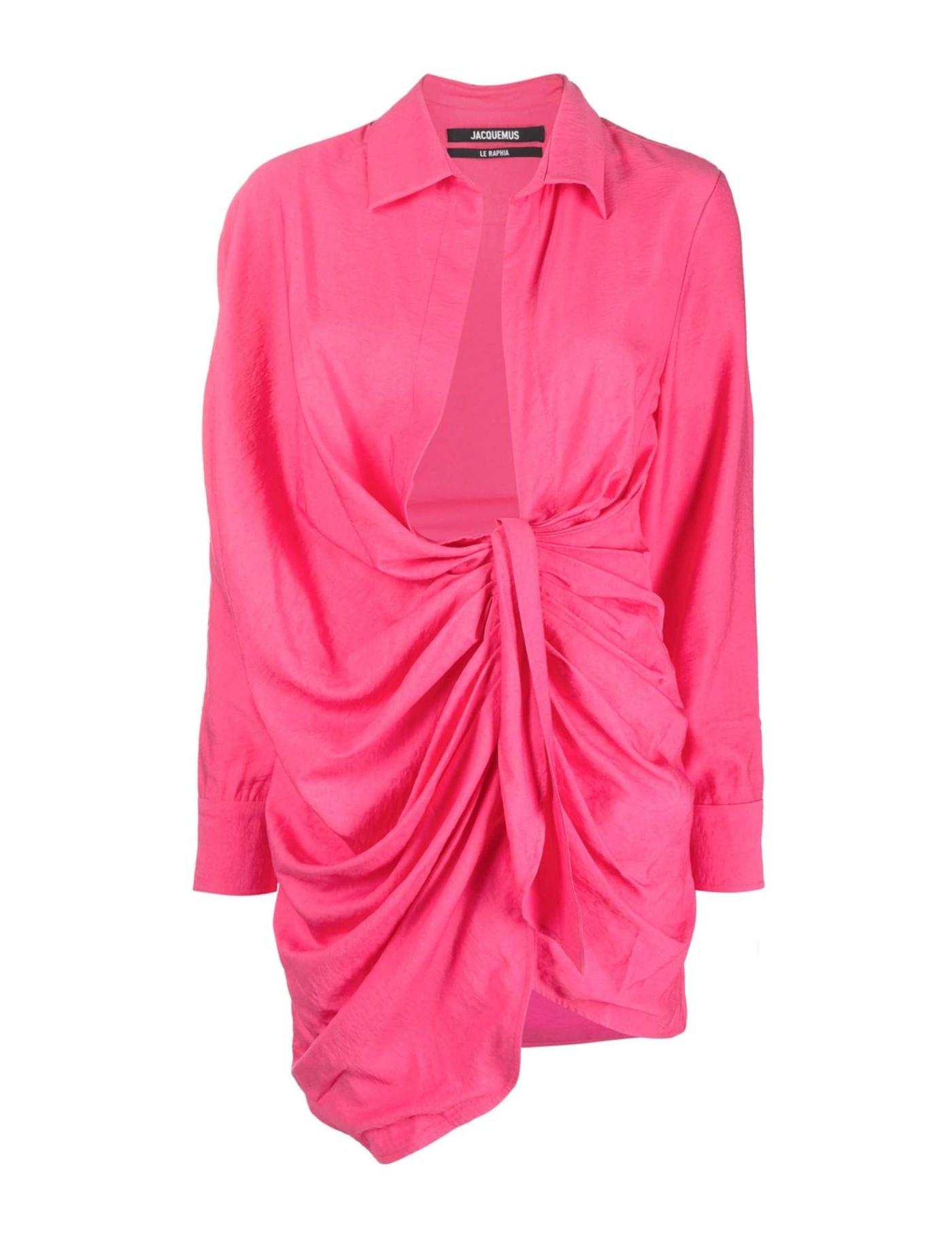 Jacquemus' La robe Bahia shirt dress is characterised by its draped, asymmetric silhouette and plunging neckline that culminates in a knot. It comes in bright pink and is cut to a relaxed design that grazes the thigh.