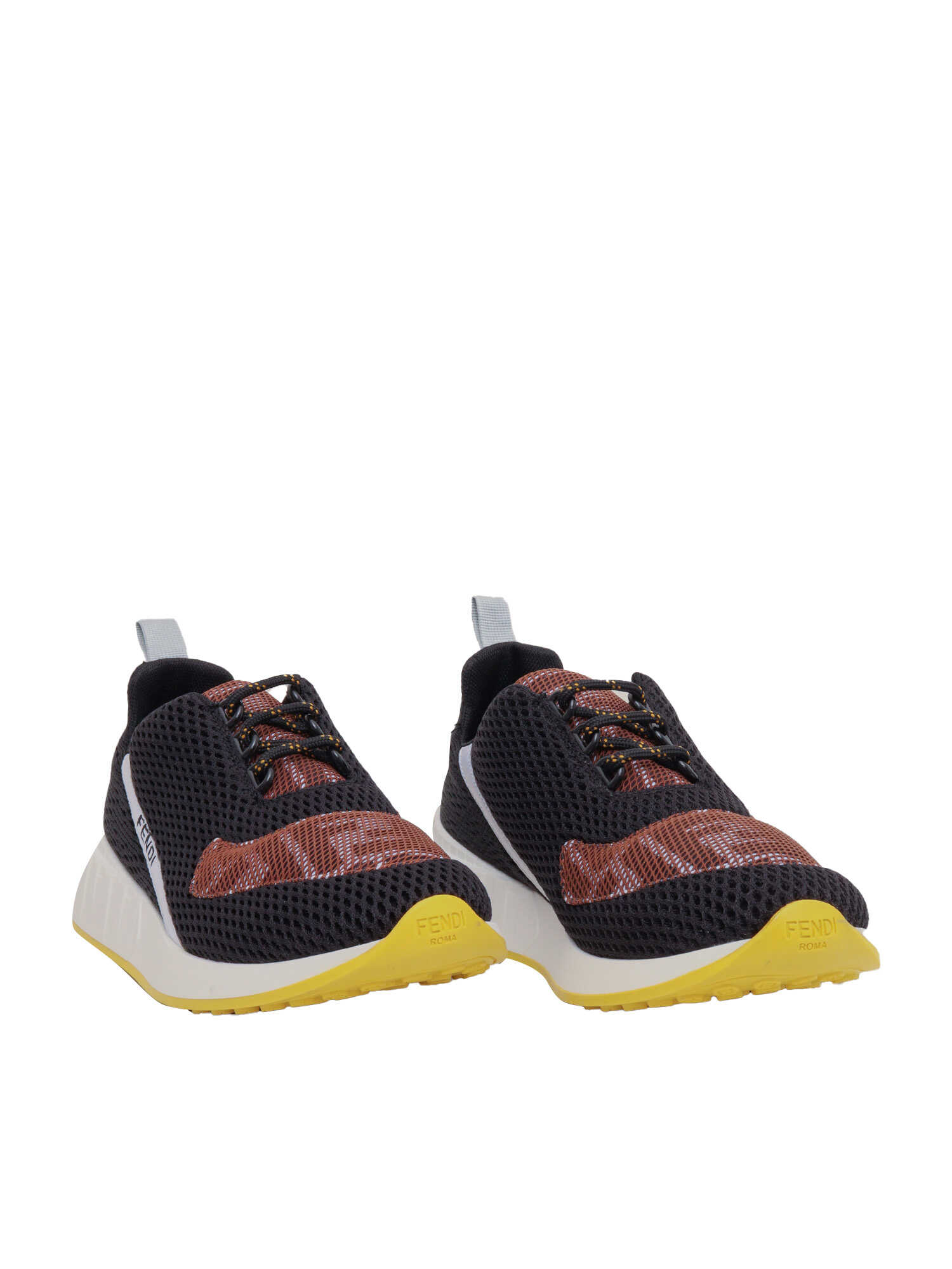 Brushed black sneakers with FF logo on the toe, black inserts, contrasting white sole, tongue for easy entry