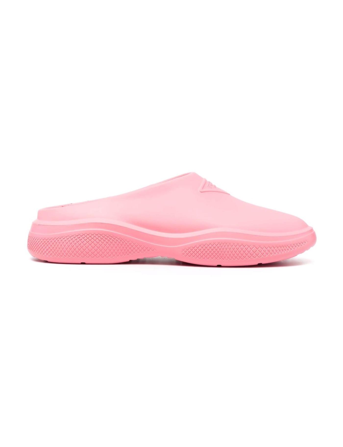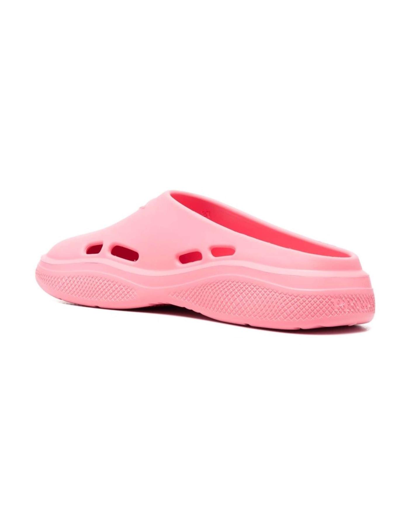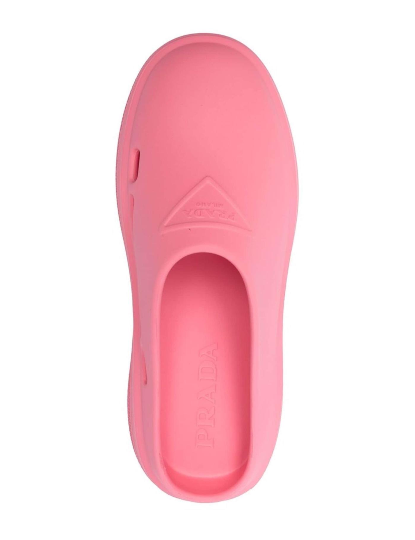 Crafted in a rubber design, these Prada slides display a debossed triangle logo to the front. The slip-on style is produced in a pink hue, with vents to the side for added ventilation.