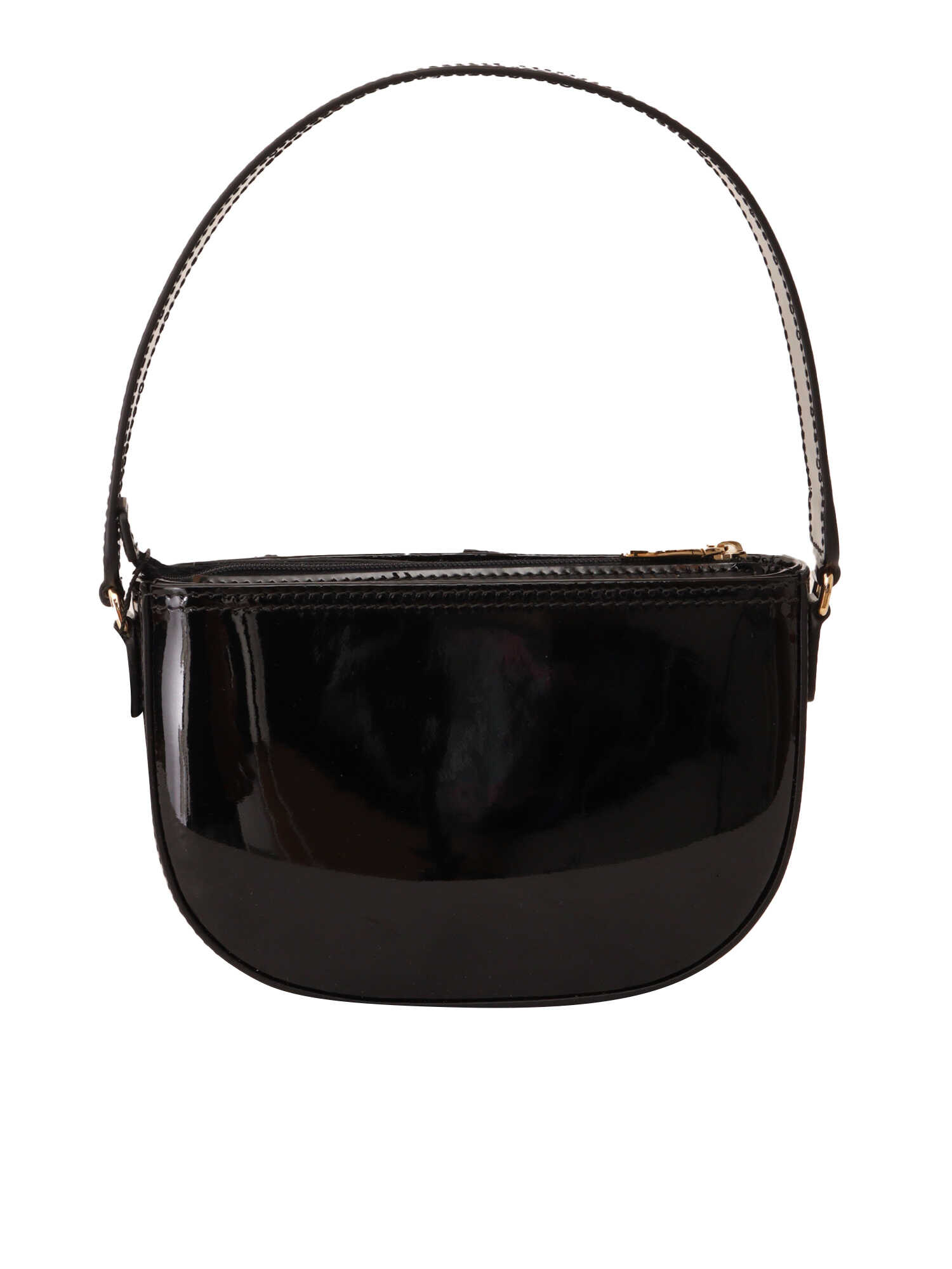 Patent leather shoulder bag, gold-tone logo plaque, logo patch, top zip fastening, single shoulder strap, front patch pockets, main compartment, satin lining 17 x 11 x 4 cm