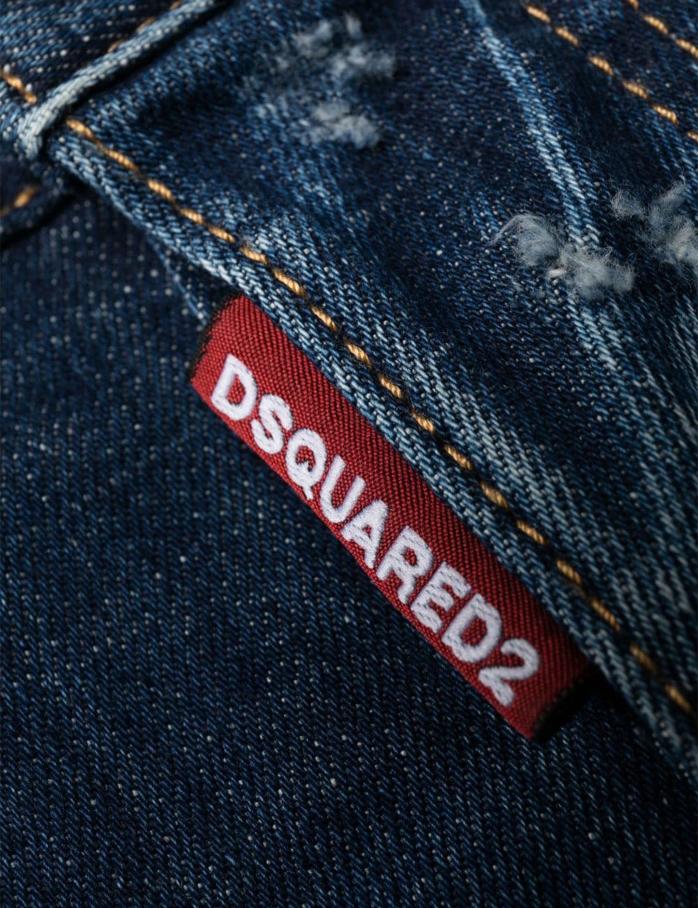 Dsquared2 24/7 jeans made of dark wash cotton denim with rips, washed-out effect details and iconic maple leaf embroidered on the back pocket. Five pocket design, logo plate on the back and button closure. Medium waist and soft leg.