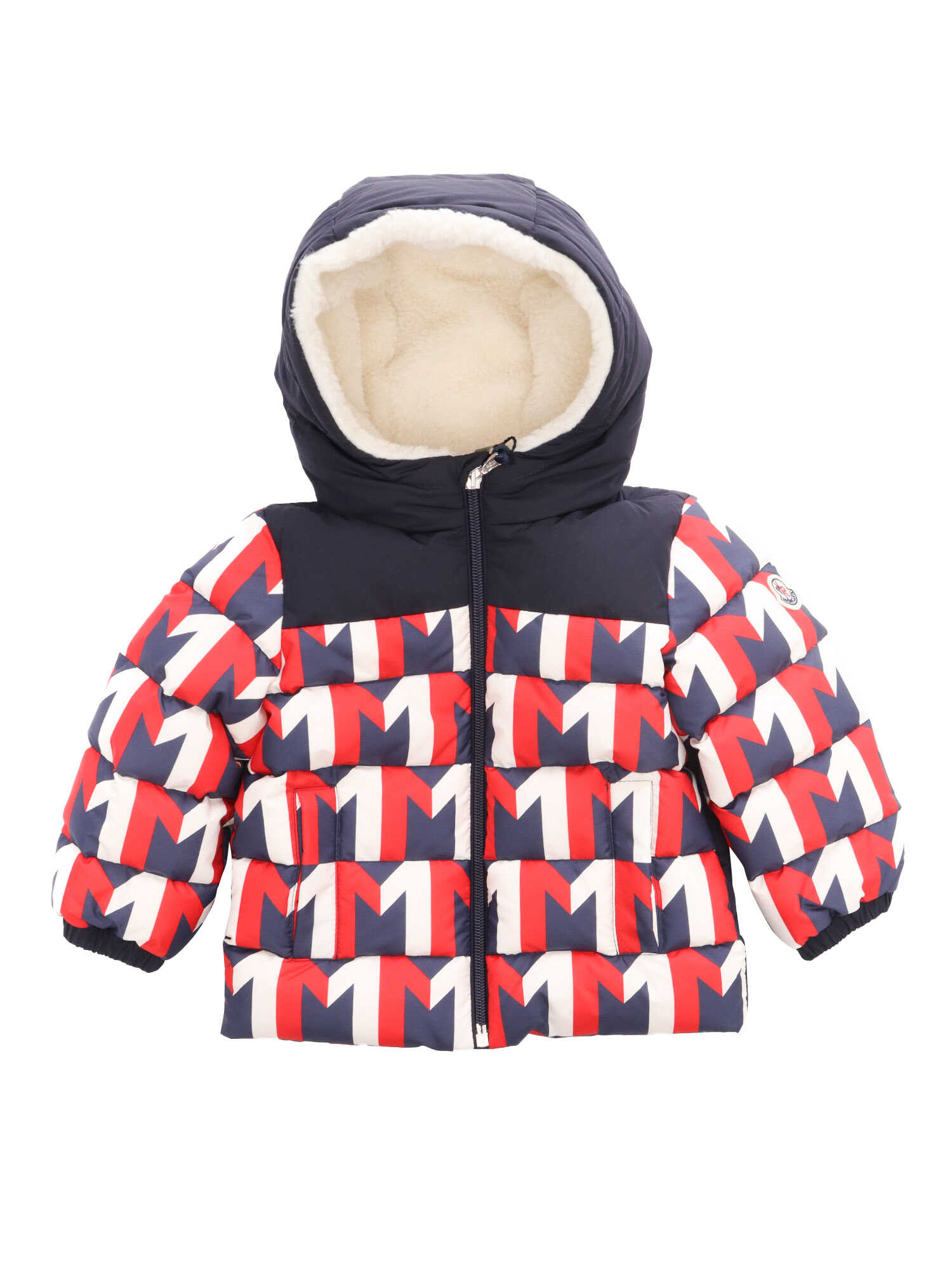 Logo printed down jacket, hood with faux fur lining, front zip closure, elasticated cuffs, logo patch on the sleeve