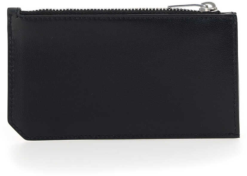 Calfskin Card Holder by Saint Laurent, three-dimensional iconic YSL logo plaque on front, card slot on front, top zipper closure.