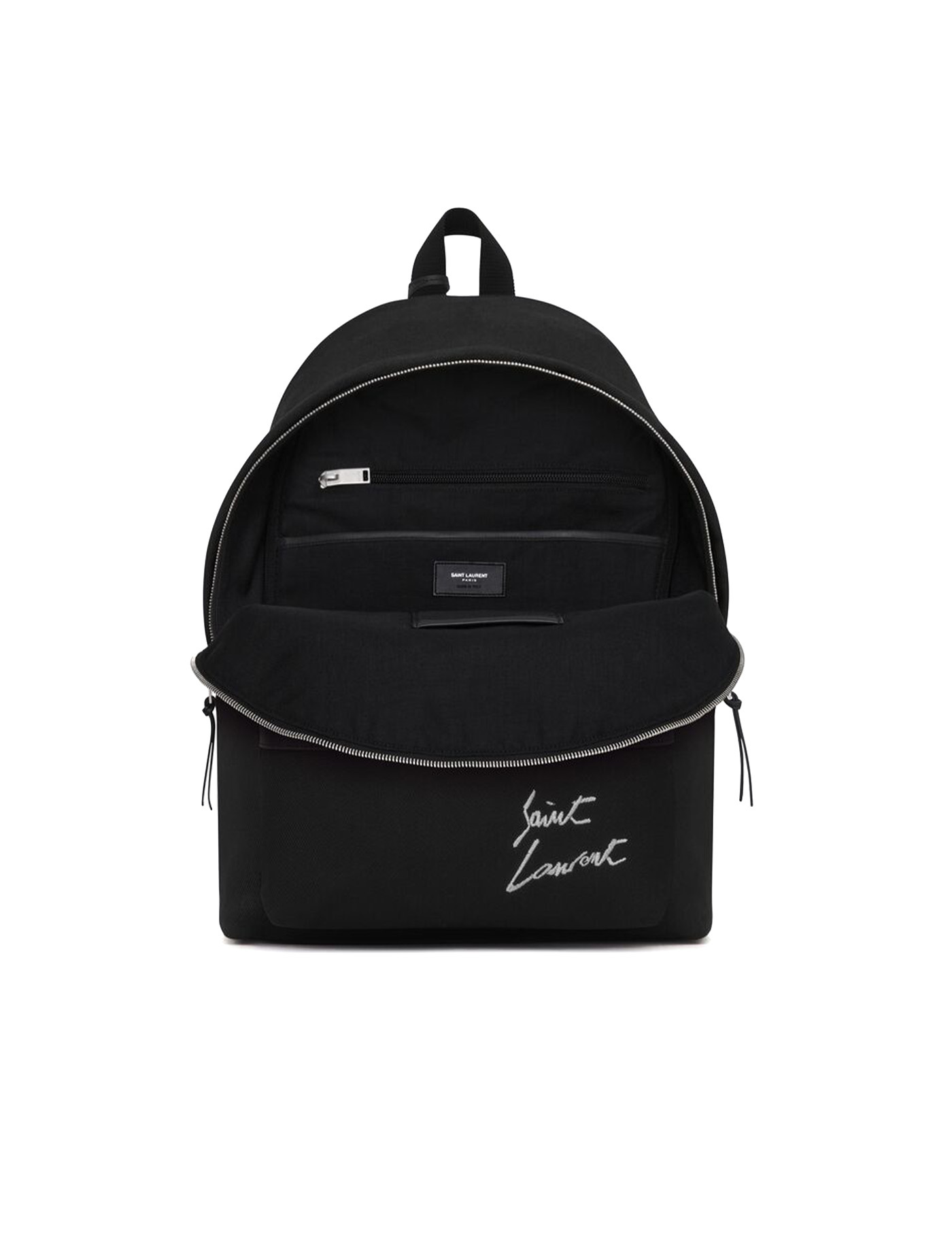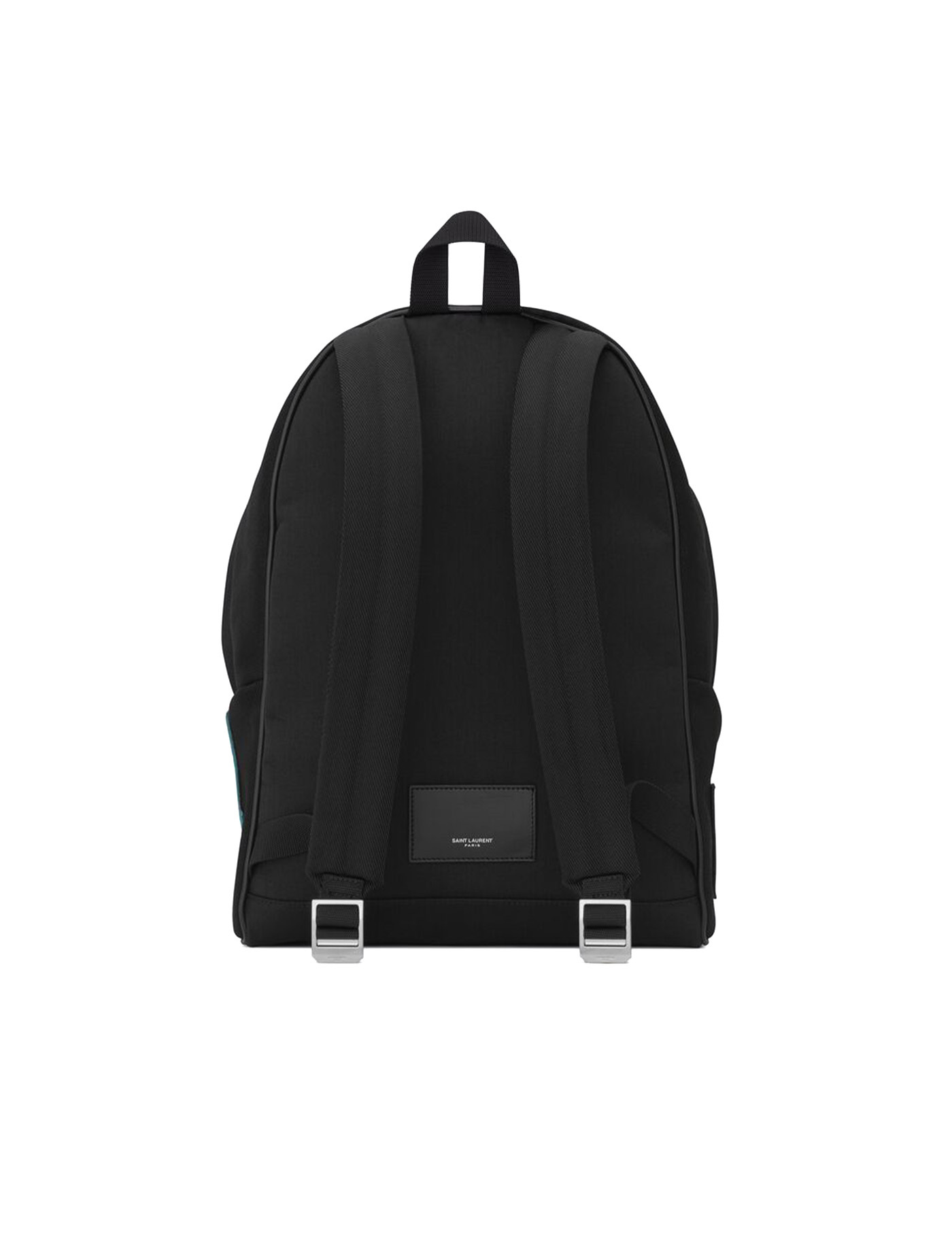 Cotton City Backpack by Saint Laurent, single top handle, padded adjustable shoulder straps, key hook attached to handle, top closure with double-slider zipper, leather trim and inserts, front zipper pocket for closure, iconic brand monogram embroidered in contrasting color on front, smooth leather logo embroidered press stud patch on back, two interior slit pockets.