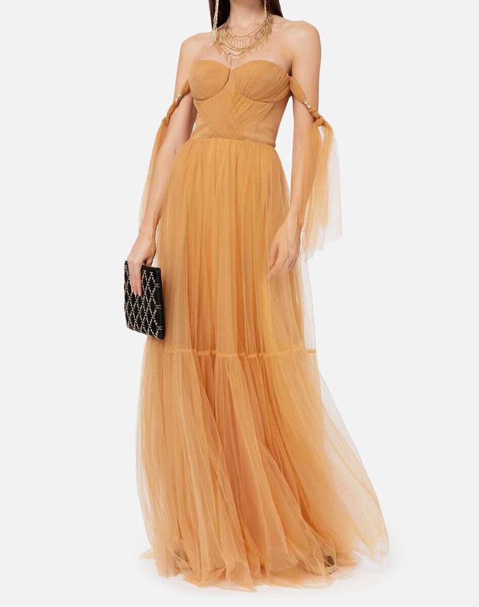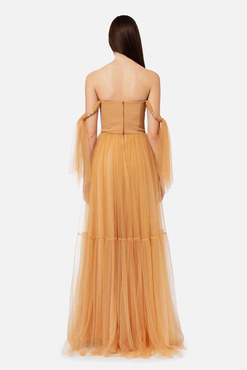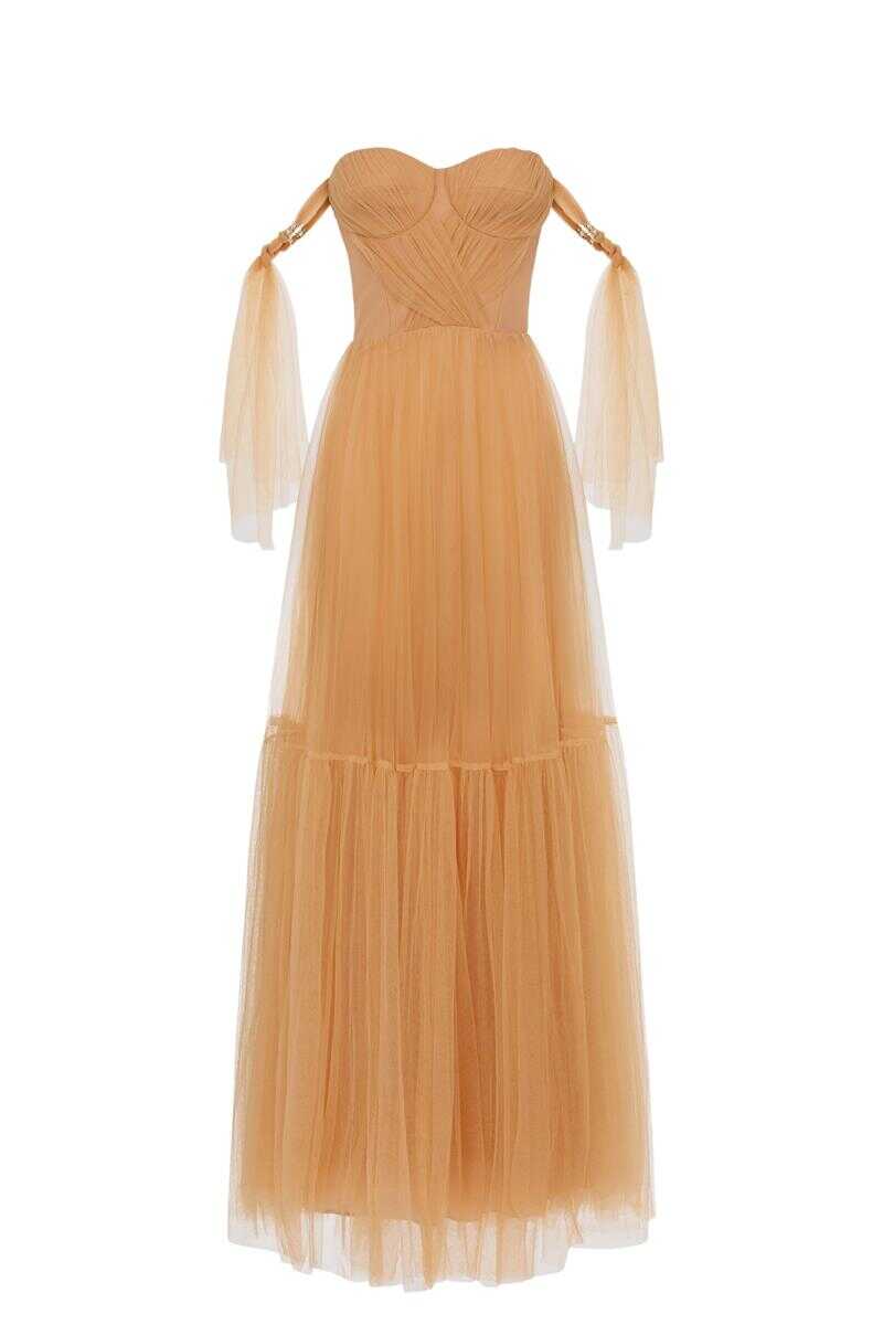 Long tulle dress with gathered bands on neckline and ruffles to tie on arms. Wide skirt with ruffled flounce at the bottom.