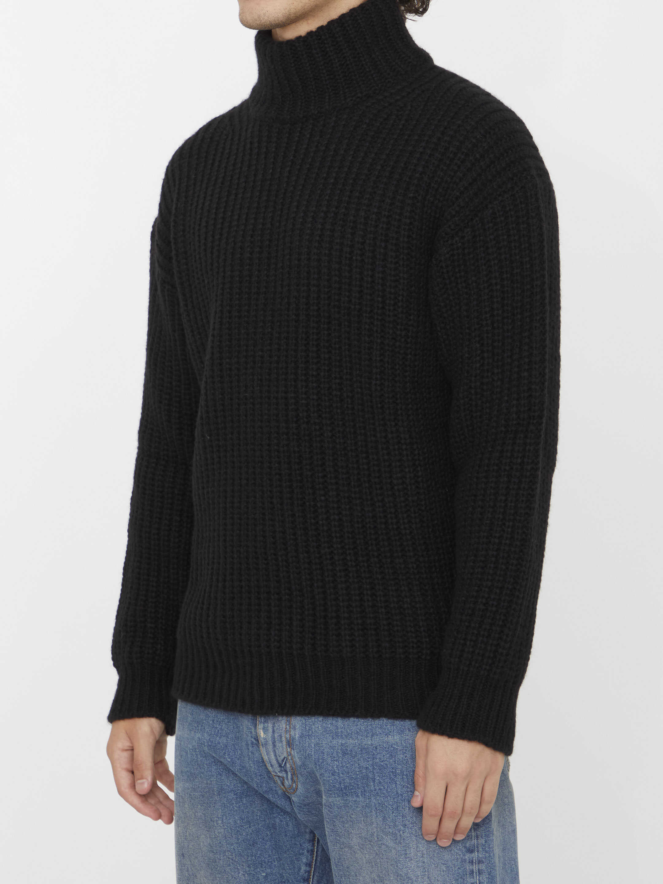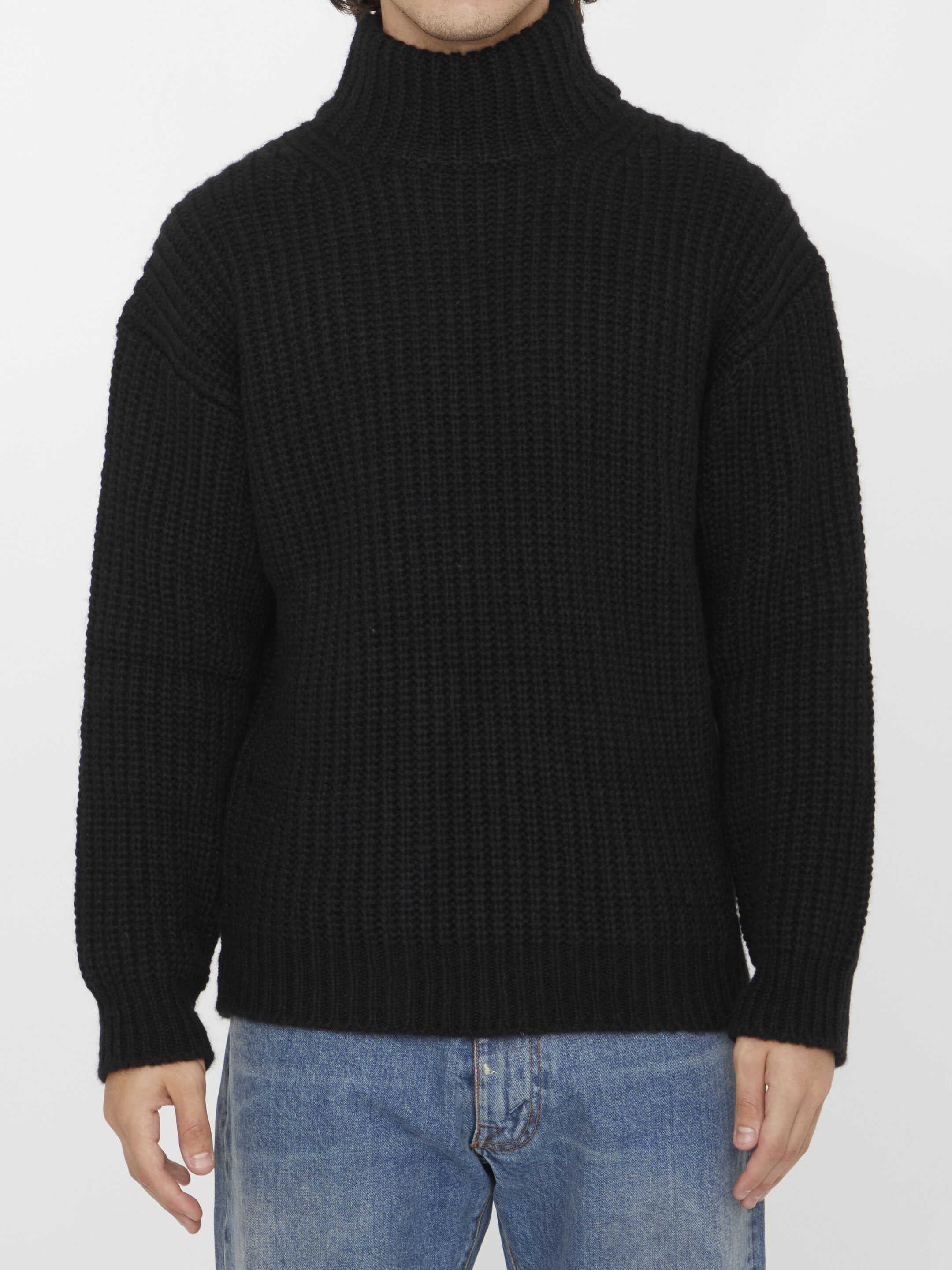 High-neck jumper in black alpaca and wool blend with ribbed design. Regular fit.