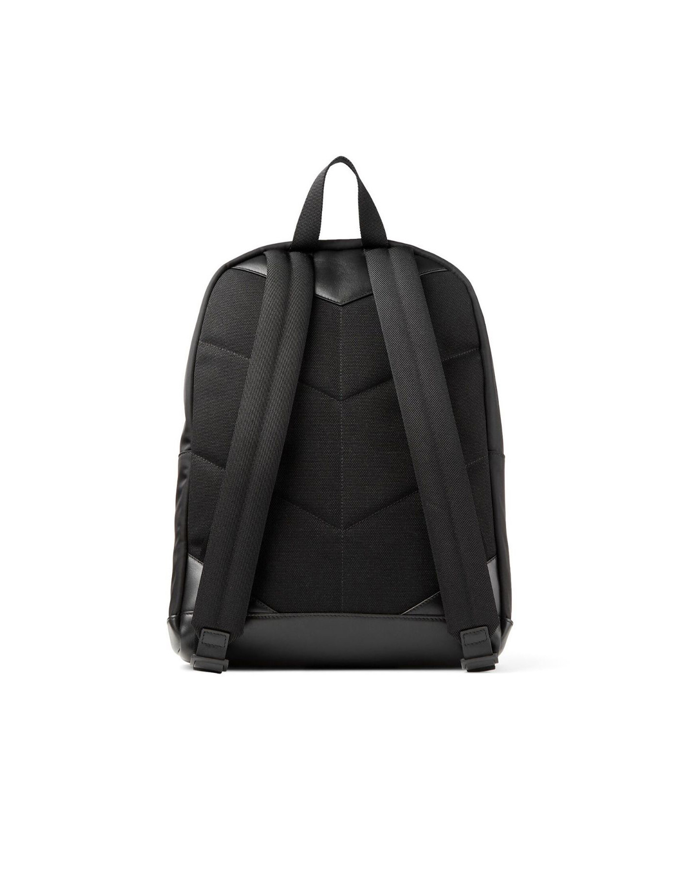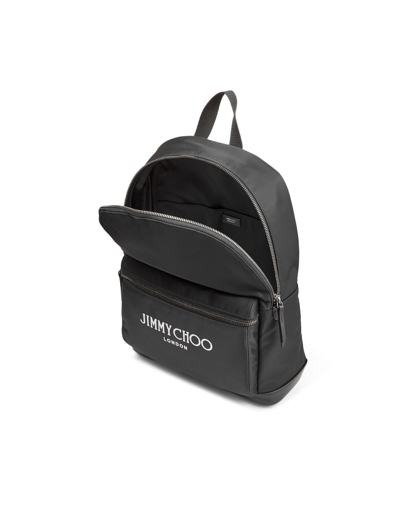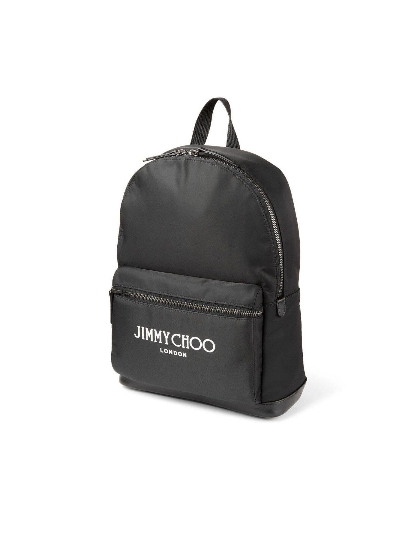 Nylon "Wilmer" backpack by Jimmy Choo with leather base and contrasting lettering logo on the front pocket. Two-way zippered closure, lined interior with a laptop compartment and two open pockets, padded back and adjustable straps.