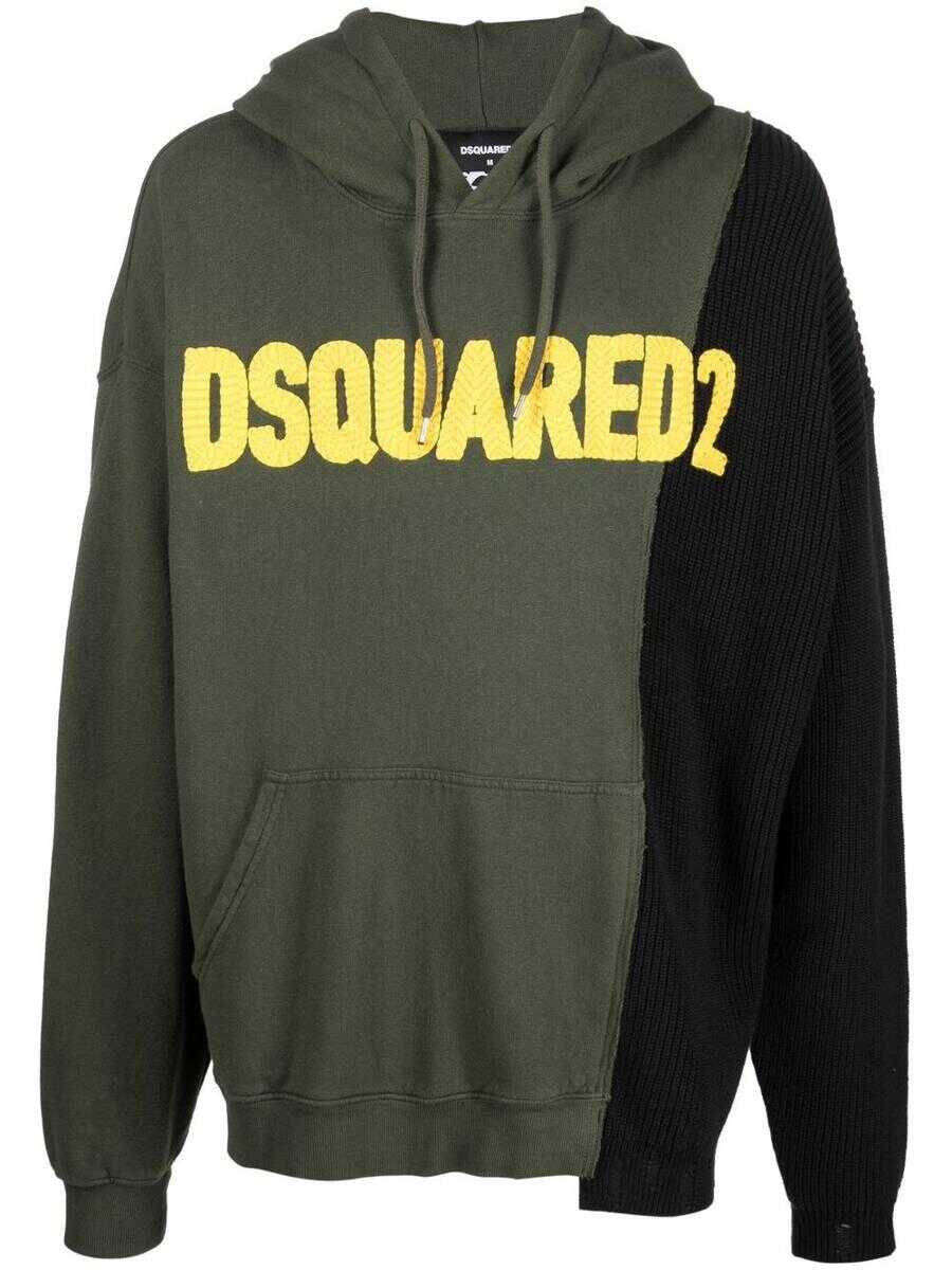 logo-patched patchwork drawstring hoodie from DSQUARED2 featuring military green, black, cotton, patchwork design, logo patch to the front, drawstring hood, drop shoulder, long sleeves, fitted-cuff sleeves, front pouch pocket and straight hem. Conscious: Purchasing this item continues its narrative and reduces the environmental impact of using new resources. You can be confident that you’re making a better choice for the Planet..