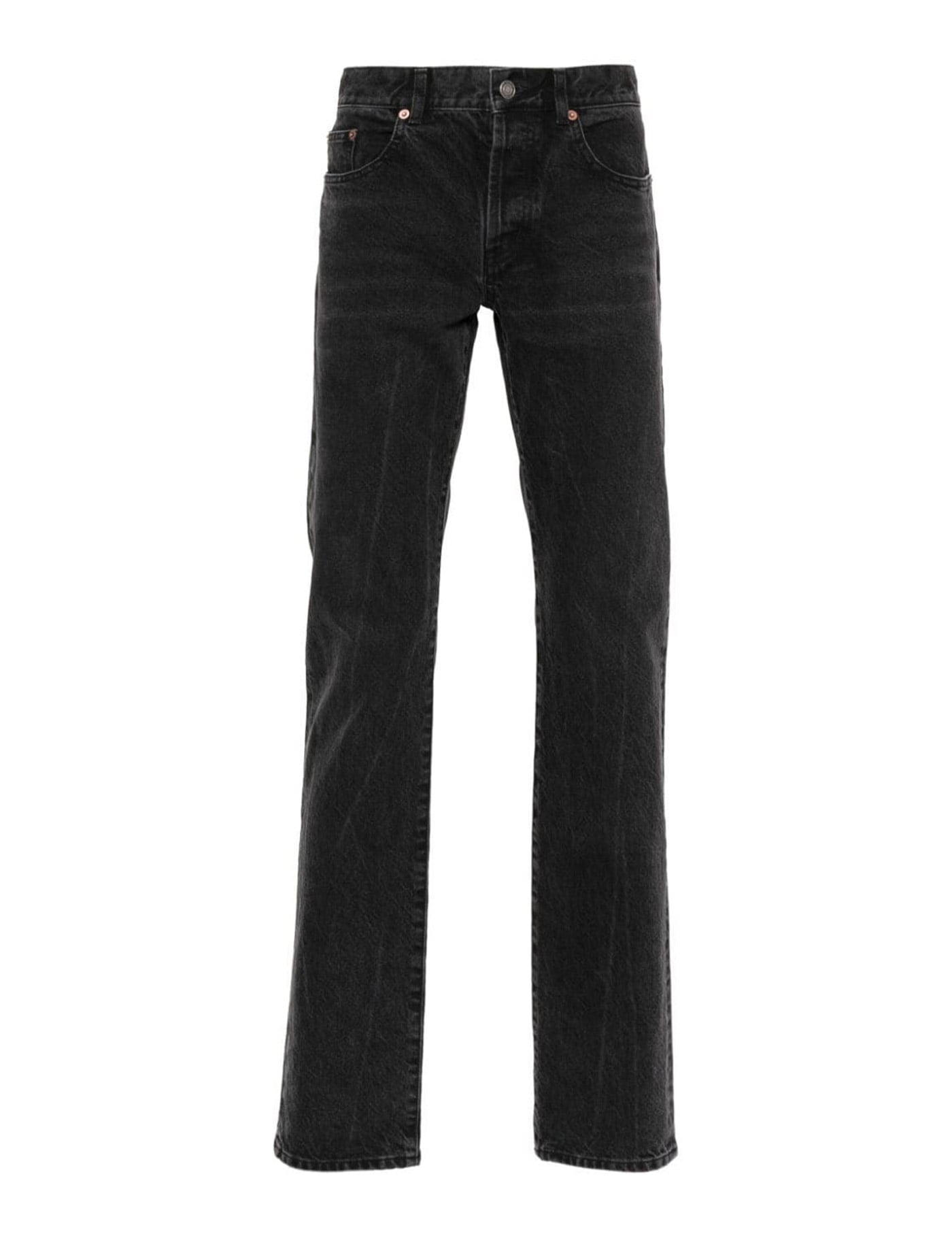 Black denim jeans. It features button closure, five-pocket design and belt loops. Slim fit.