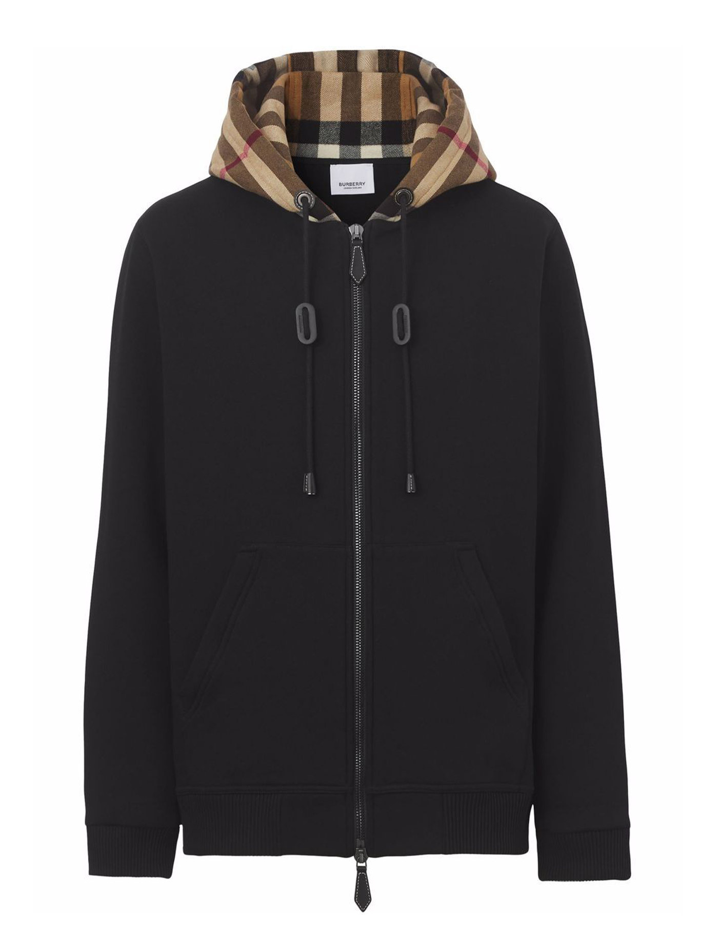 Cotton Samuel Hoodie by Burberry, hood with iconic Check Archive pattern adjustable by drawstring, ribbed cuffs, two slit pockets attached to front, front zipper closure, ribbed hem, monochrome design, regular fit.