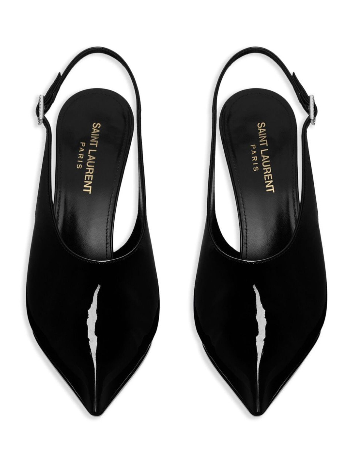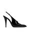 Nico slingback pumps in black patent calfskin leather. They feature pointed toe, adjustable ankle strap with crystal buckle and stiletto heel. Leather sole. Any leather imperfections are not to be considered manufacturing defects, but a peculiarity of the material.