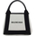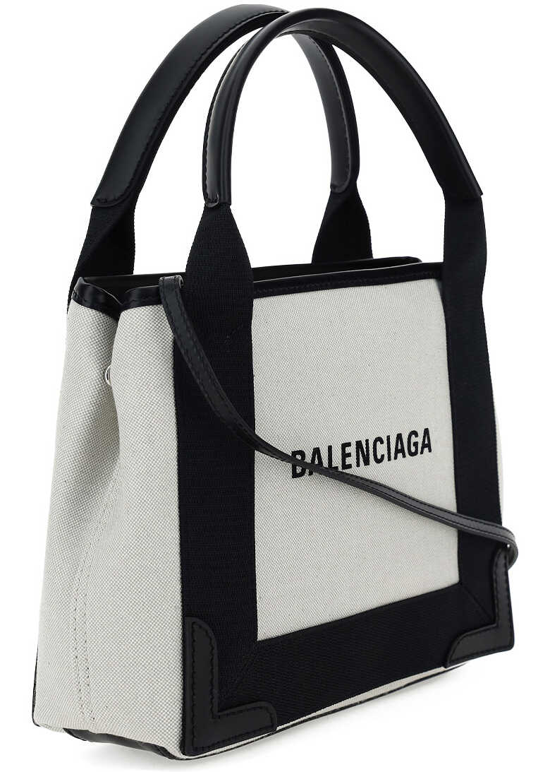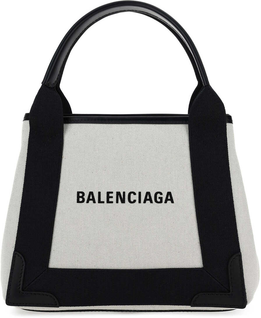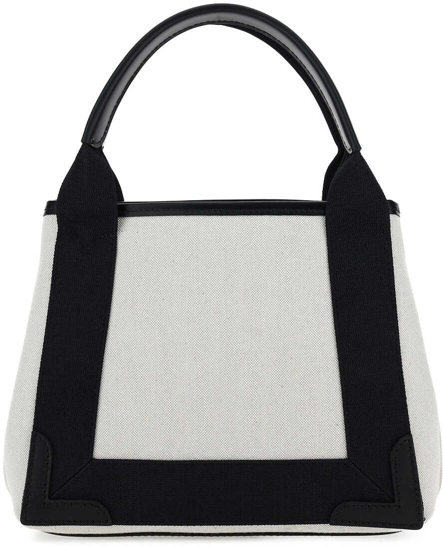 Cotton Cabas Handbag by Balenciaga, two rigid leather handles, iconic contrasting brand monogram on front, thin leather shoulder strap, snap buttons on sides, interior pouch with zipper closure.