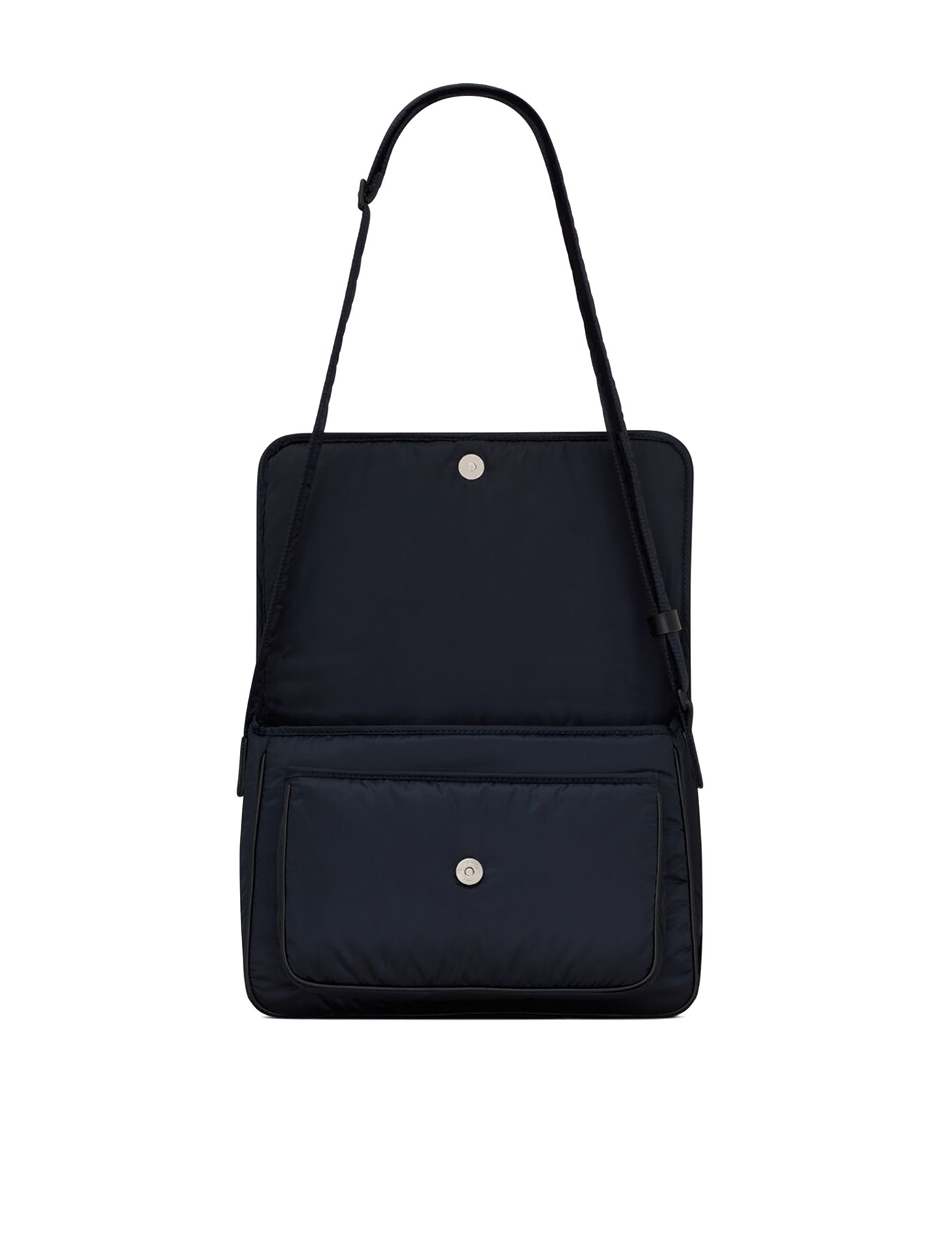 Niki Camera Shoulder Bag by Saint Laurent, front closure by magnetic flap, all-over padded and quilted chévron fabric design, embossed and matching iconic YSL brand logo plaque on front, triple interior compartment, removable and adjustable shoulder strap.