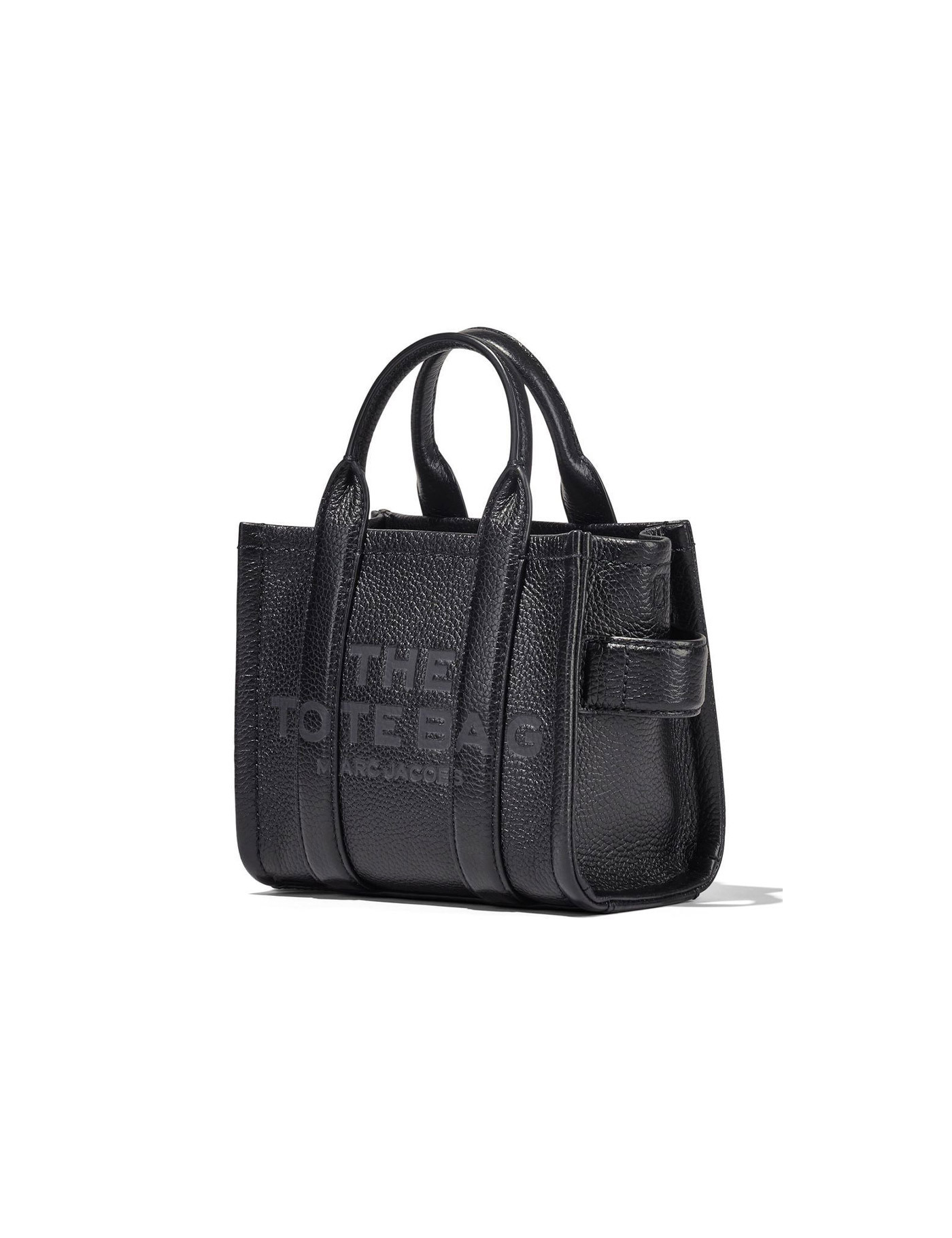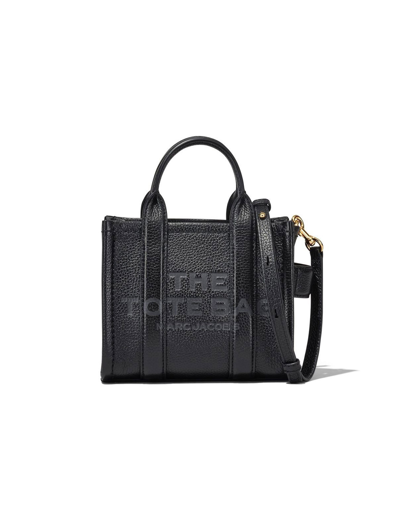 The Leather Crossbody Tote bag by Marc Jacobs made of black grained leather with tonal logo on the front. Lined interior, zip closure, top handles and adjustable and removable shoulder strap in tone. Details in golden metal, measures 18x10x15 cm.