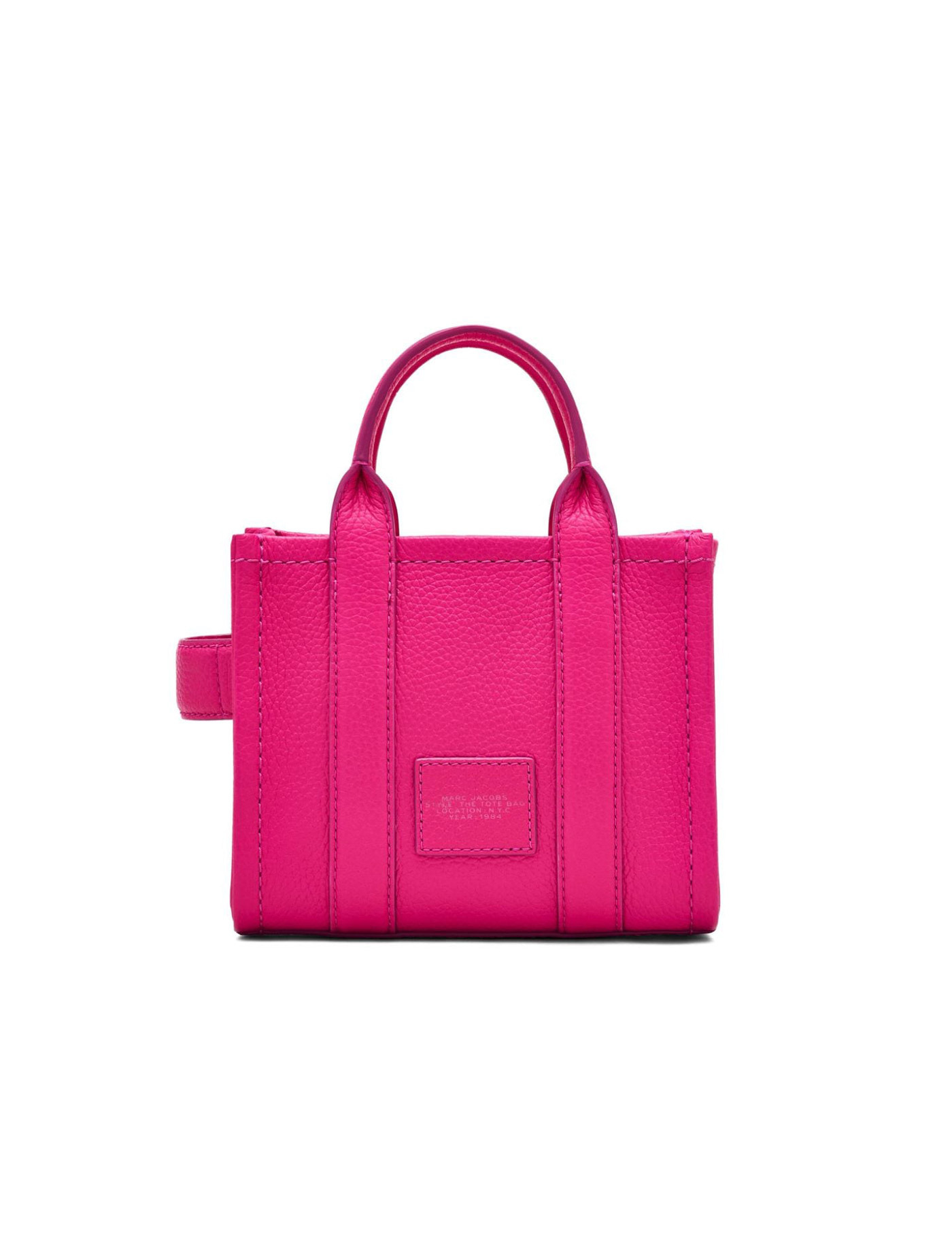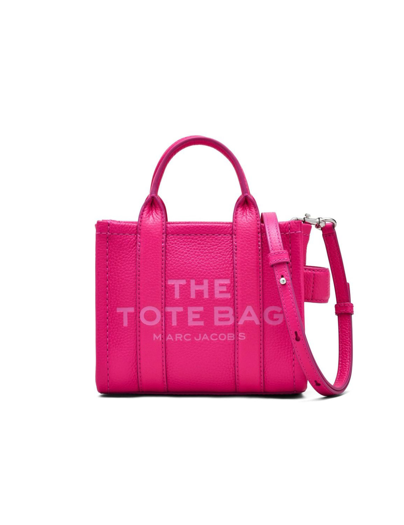 Marc Jacobs The Leather Crossbody Tote bag, made from hammered magenta-colored leather, with an embossed logo on the front. Golden metal details. Interior with pocket, zip closure, adjustable and removable shoulder strap. Measurements 18x10x15 cm.