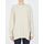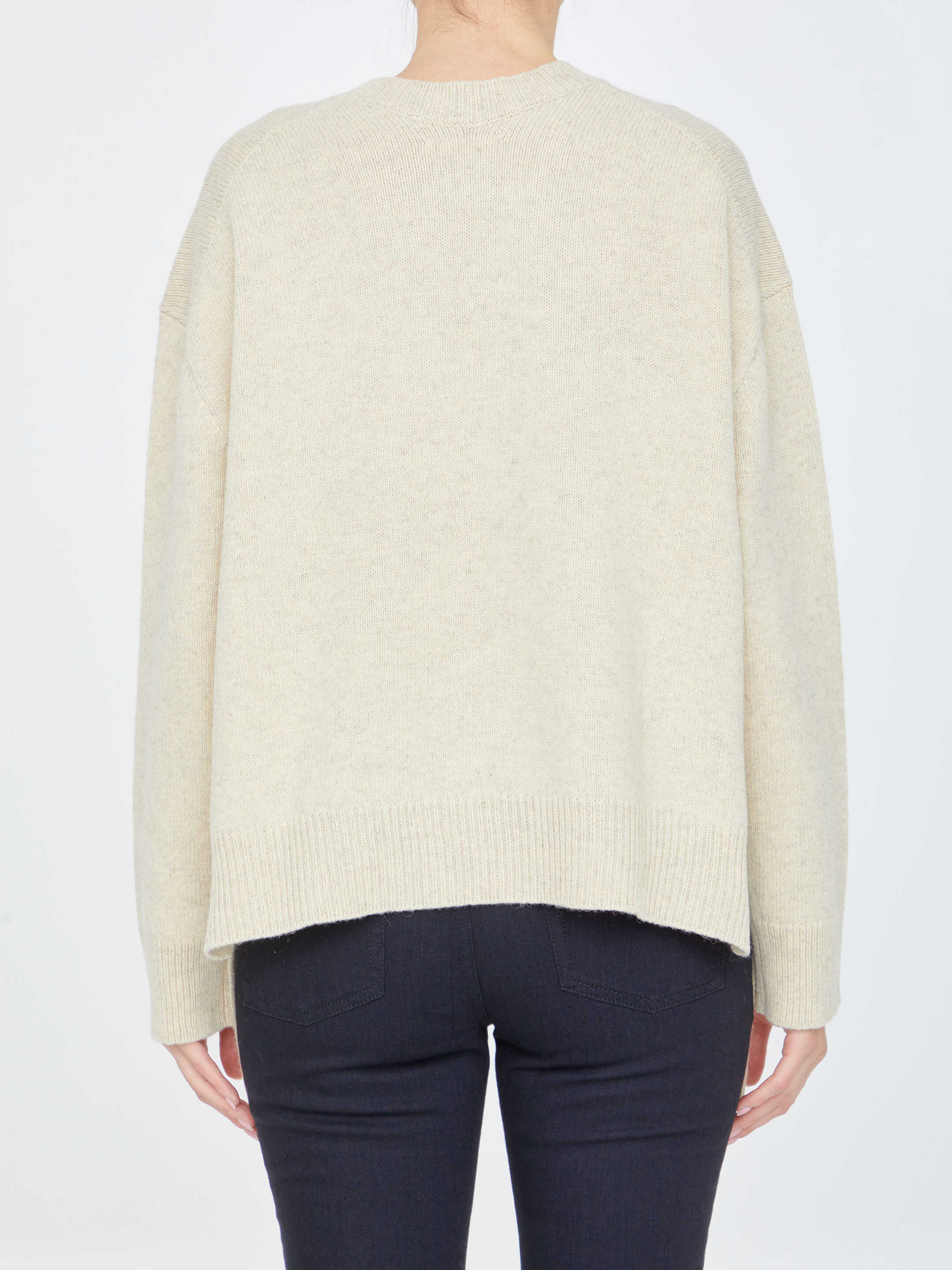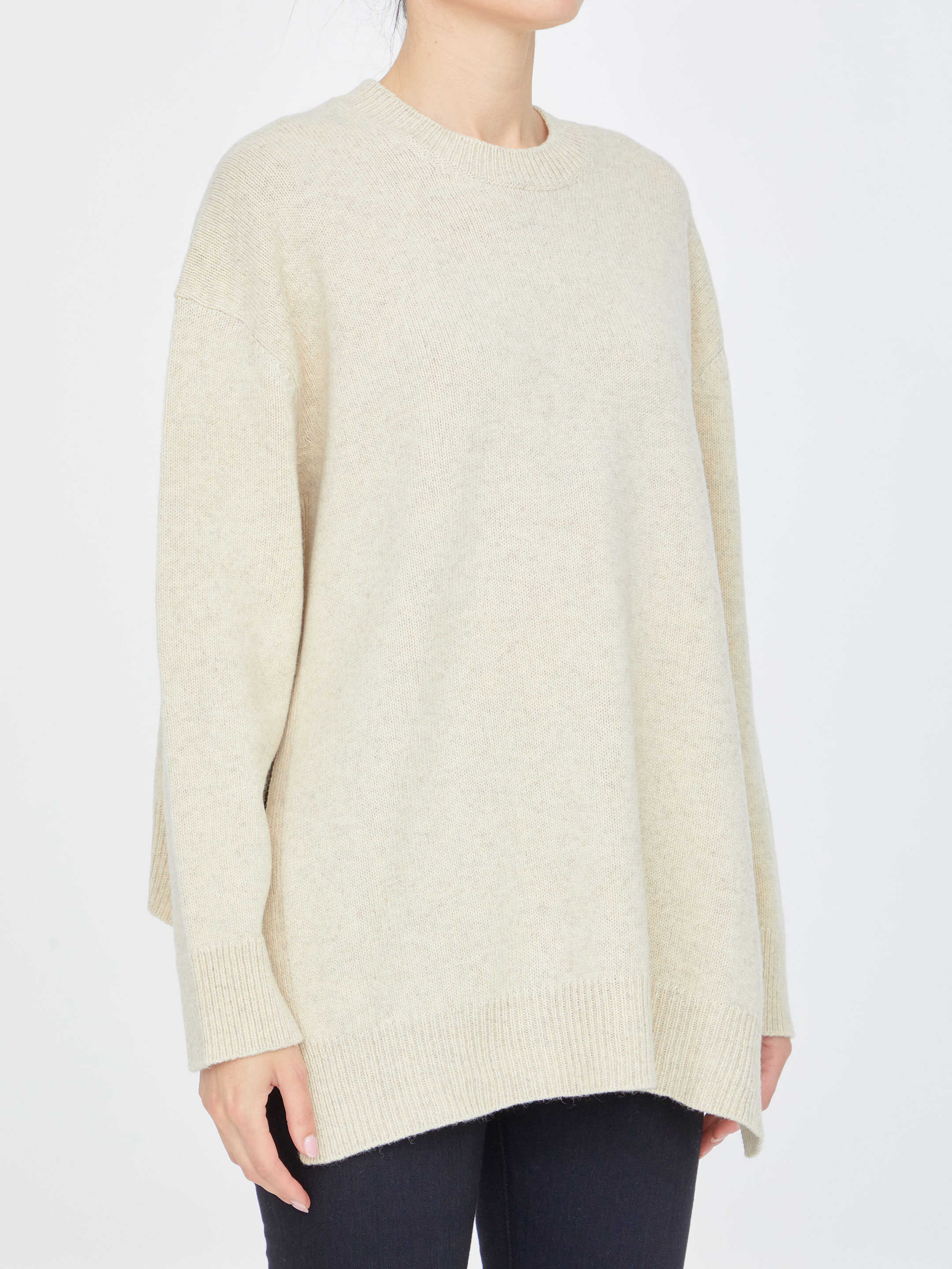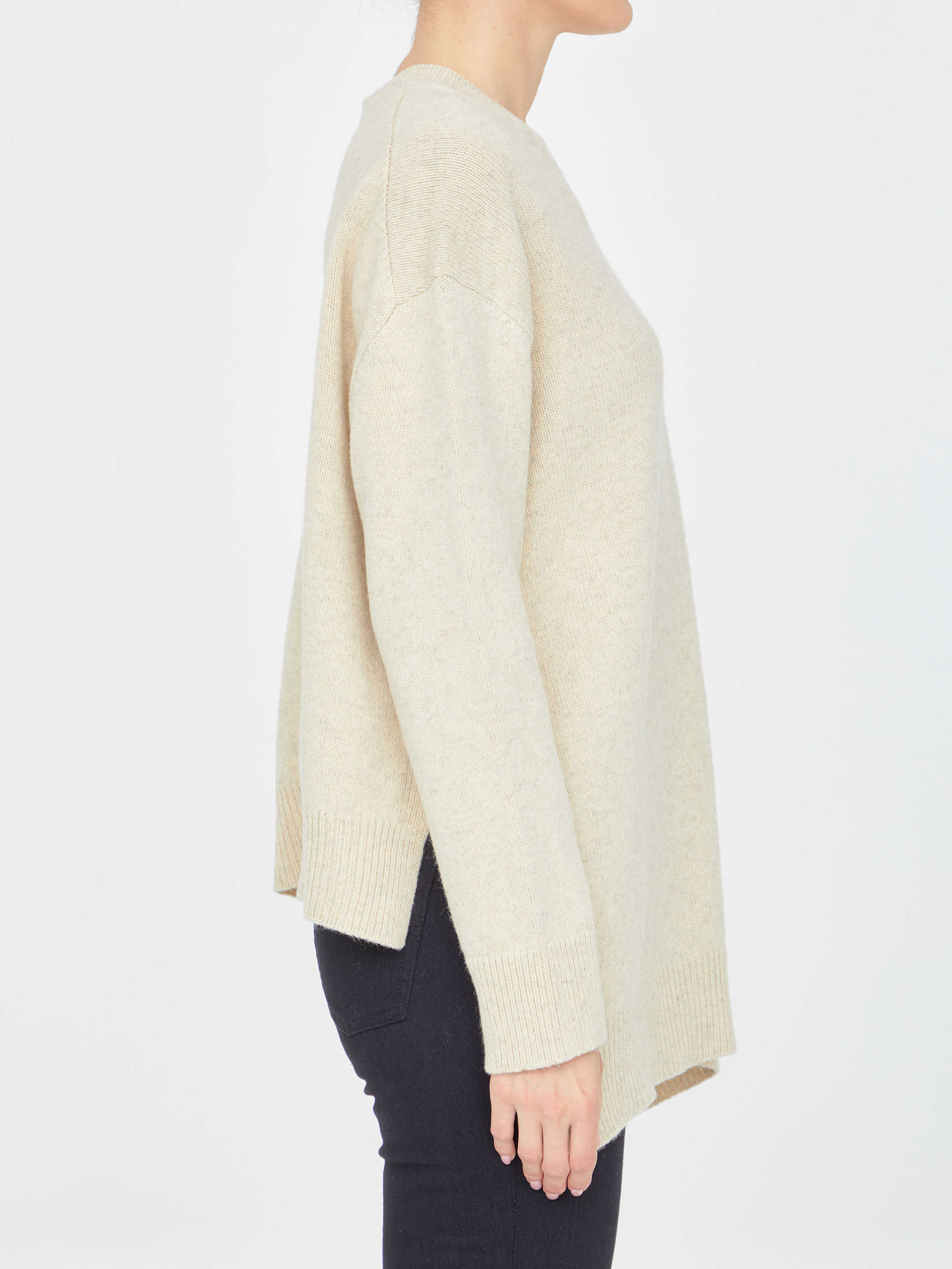 Long-sleeved crewneck jumper in beige wool with asymmetrical hem and side slits. Ribbed neck, cuffs and hem.