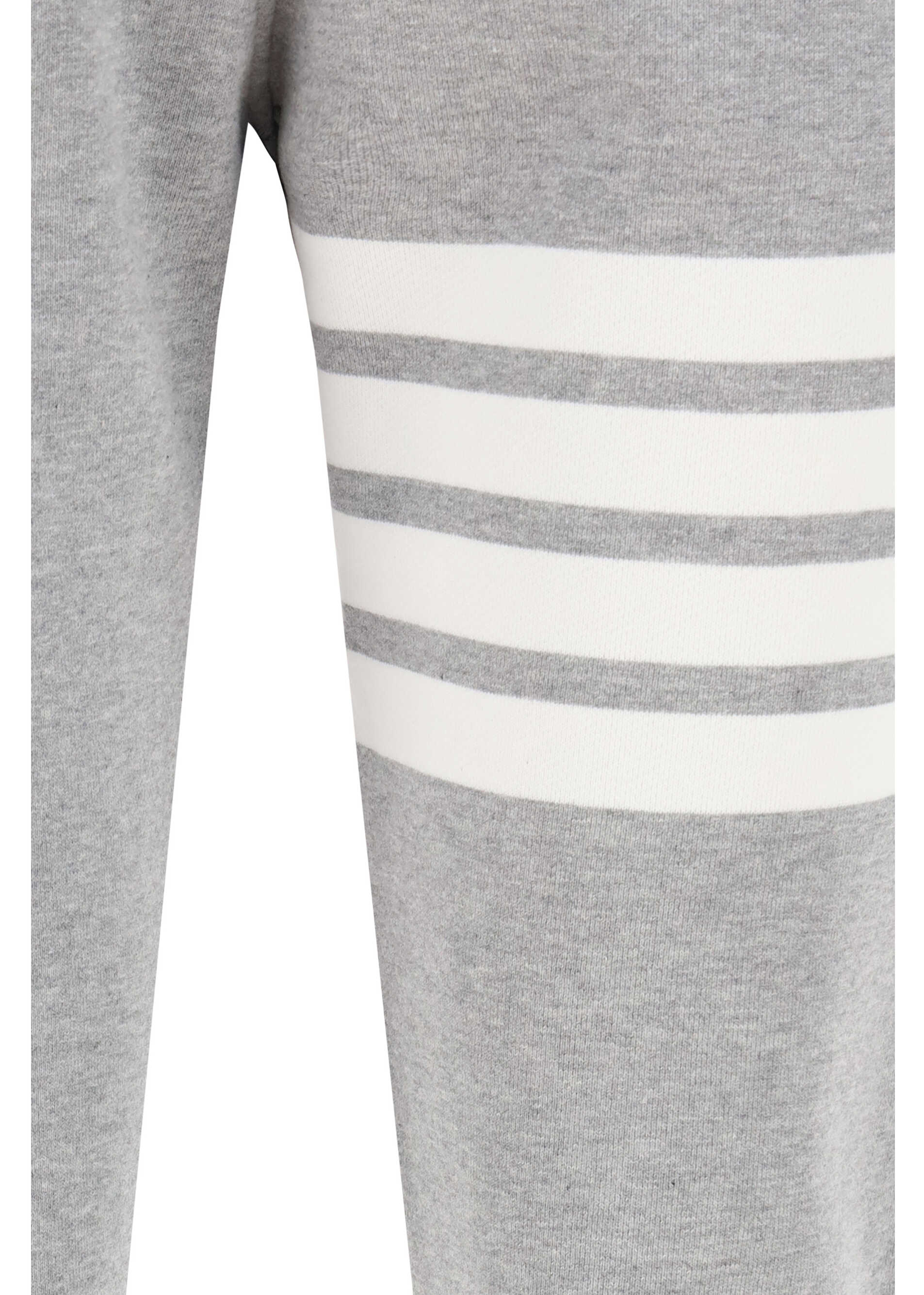 Cotton Sweatpants by Thom Browne, elasticized waistband with adjustable drawstring, two welt pockets on front, iconic white bands on left leg, iconic brand patch applied in contrast on back, jogger style.