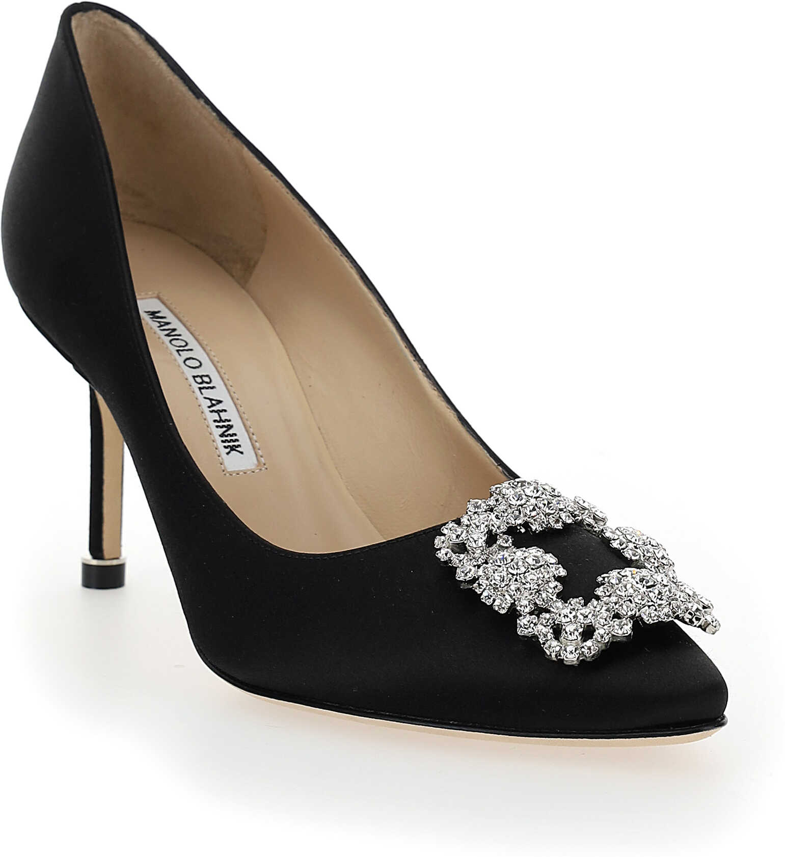 Silk Satin Hangisi Pumps by Manolo Blahnik, almond toe, iconic Swarovski crystal buckle appliqué on front, leather stiletto heel, logo-embossed insole.