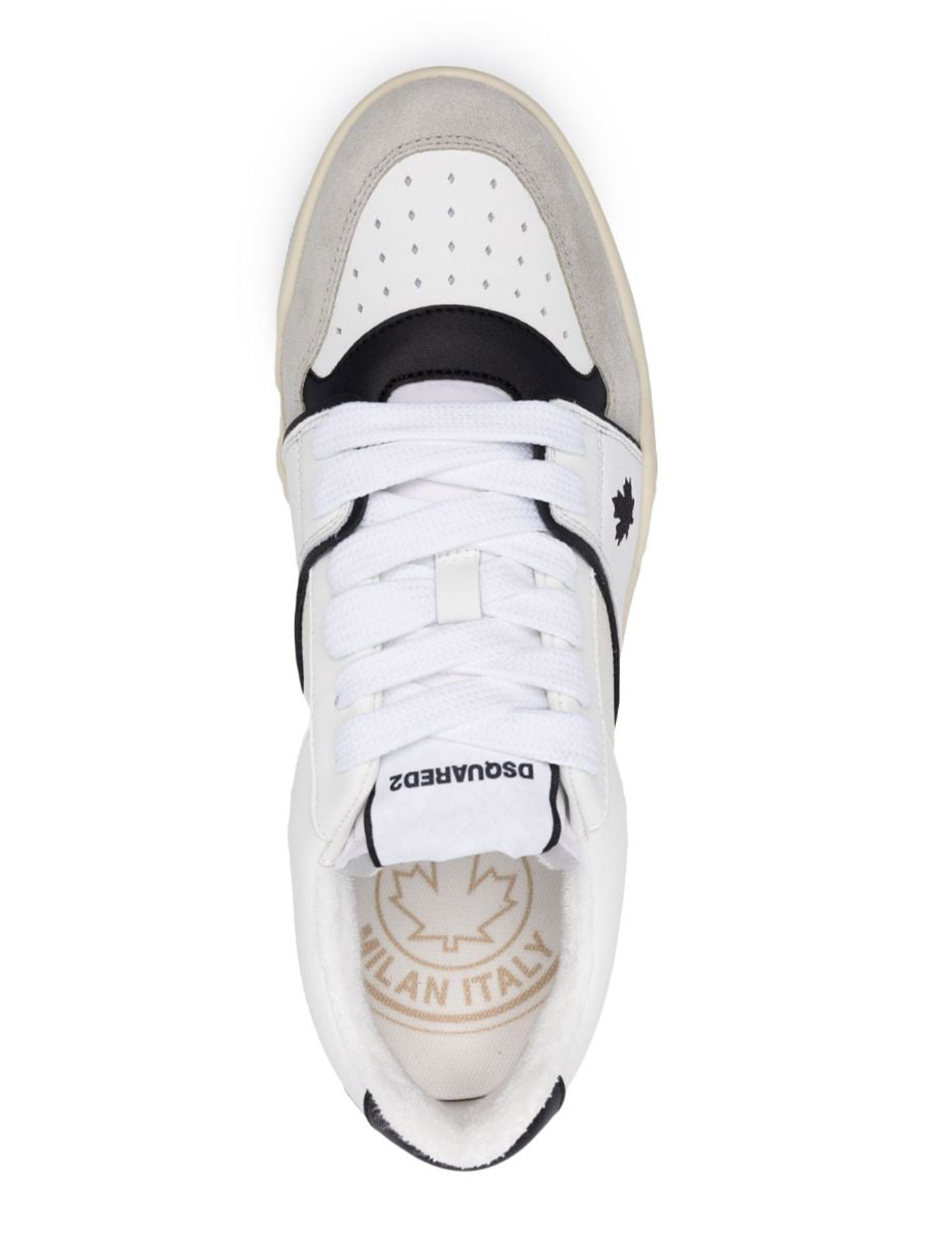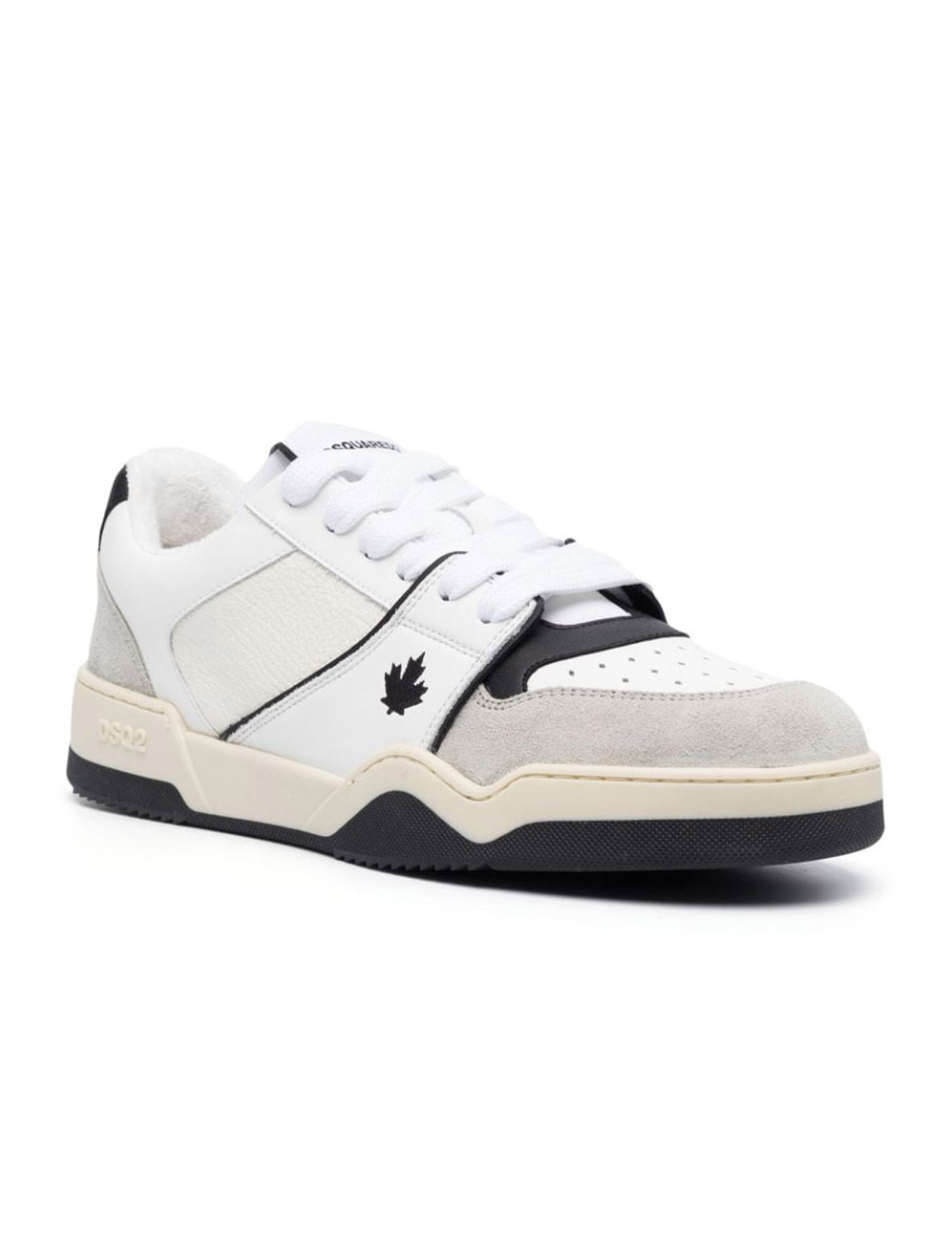 Dsquared2's Spiker sneaker made of hammered leather, smooth leather, and suede in shades of white, gray, and black. Perforated toe, white cotton laces with a wide weave, sponge tongue, and embroidered logo on the side. Cotton sponge lining and fabric insole. Rubber sole, height 3.5 cm.