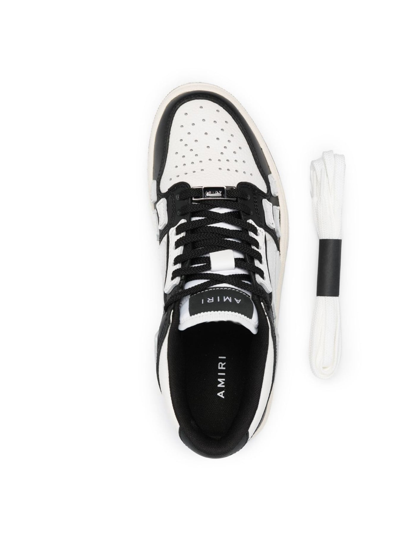 Skel-Top Low sneakers in white and black leather with leather bones appliqué. They feature perforated round toe, lace-up closure, embossed Amiri logo on heel, molded EVA footbed and rubber sole.
