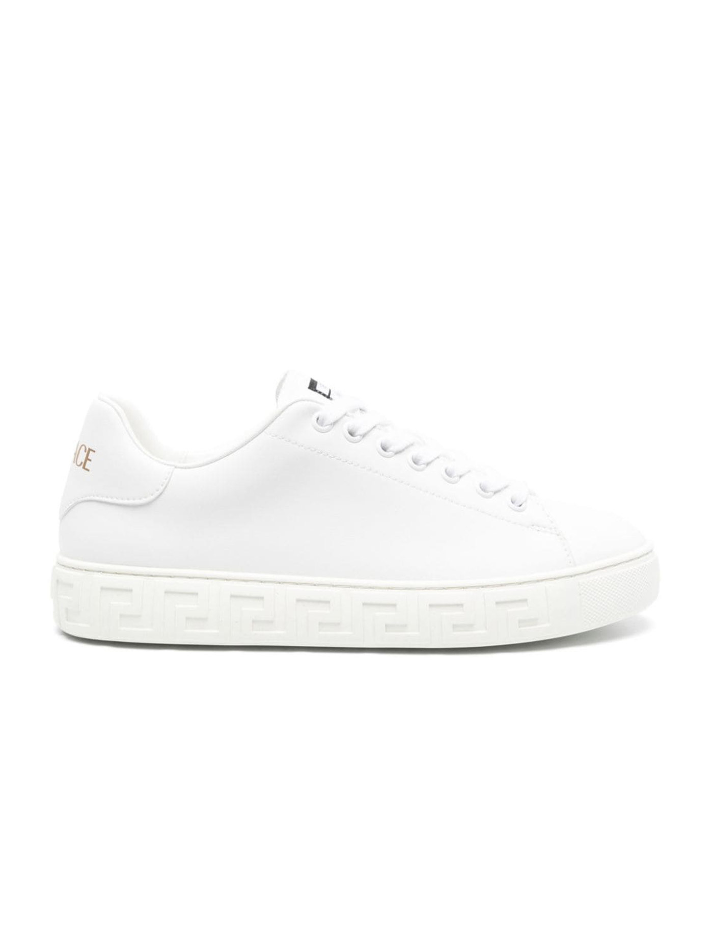 Calfskin Sneakers by Versace, featuring round toe, front lace-up closure, flat sole with iconic Greek embossed print, iconic monogram stamped press-stamped on back, press-stamped logo insole.