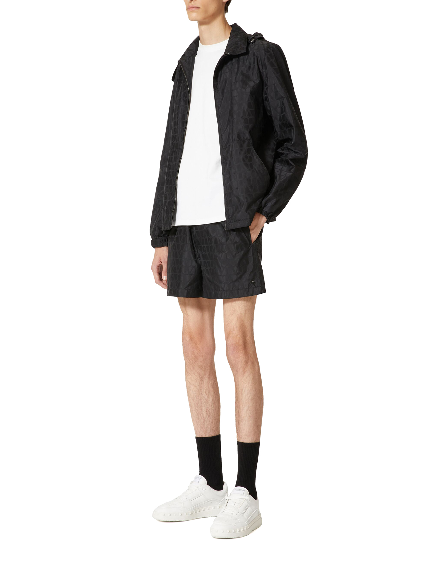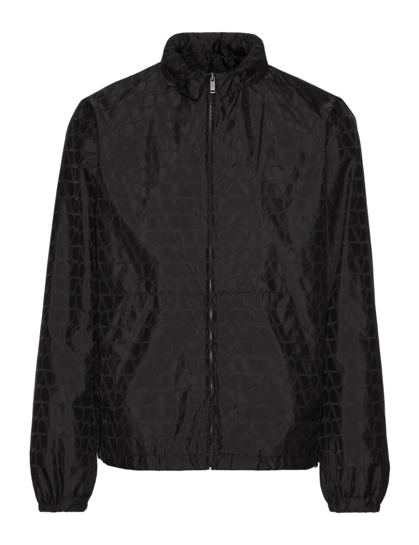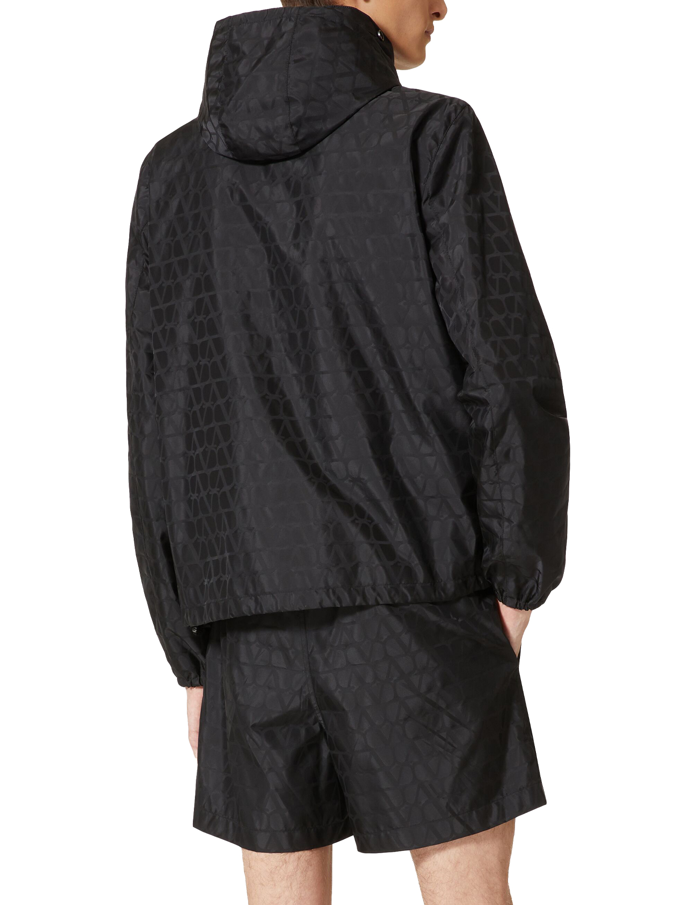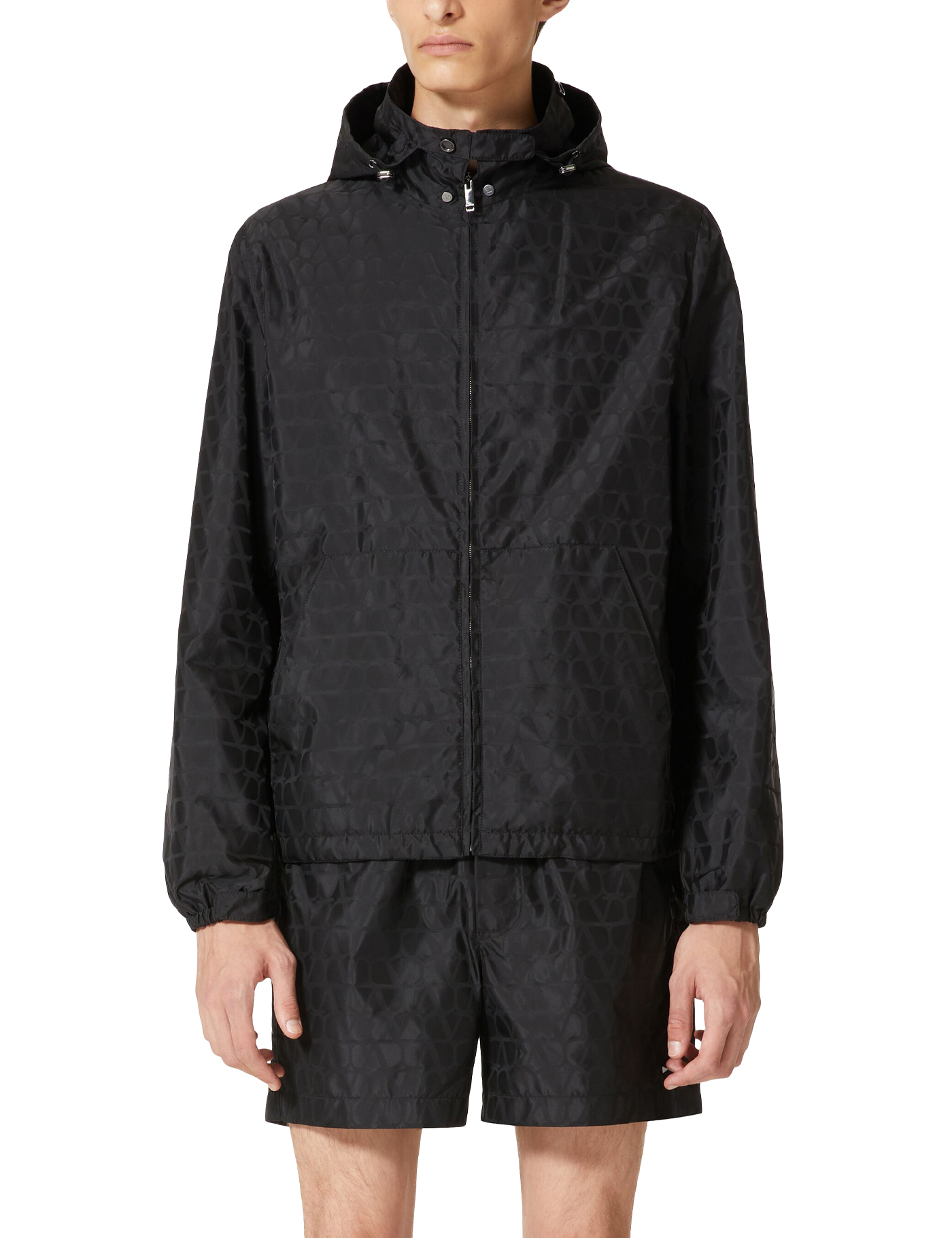 Valentino windbreaker in black nylon with all-over Toile Iconographe motif. It features drawstring hood, front zip closure, two side welt pockets, stretch cuffs and drawstring on hem. Mesh lining. Slim fit.