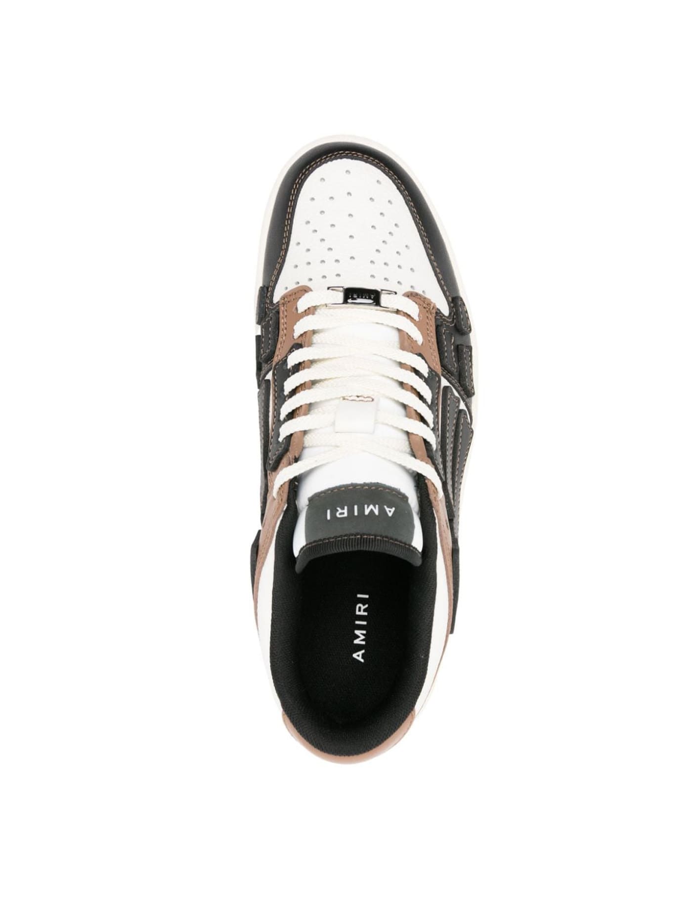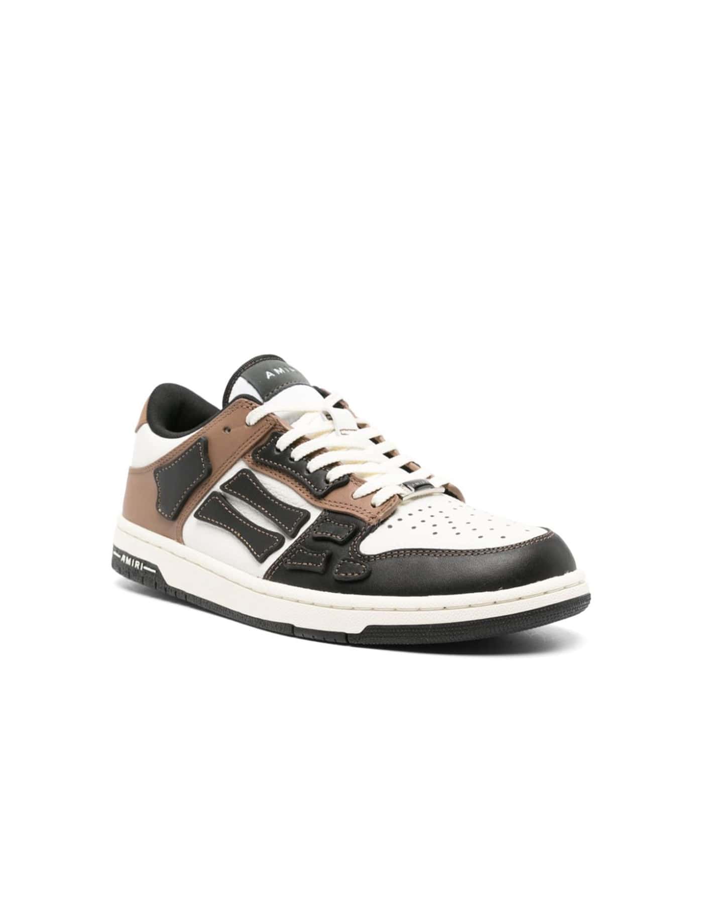 Skel Top Low sneakers in white, black and brown leather with leather bones appliqué. They feature lace-up closure, round toe, Amiri logo engraved on tongue, molded EVA footbed and logoed rubber sole.