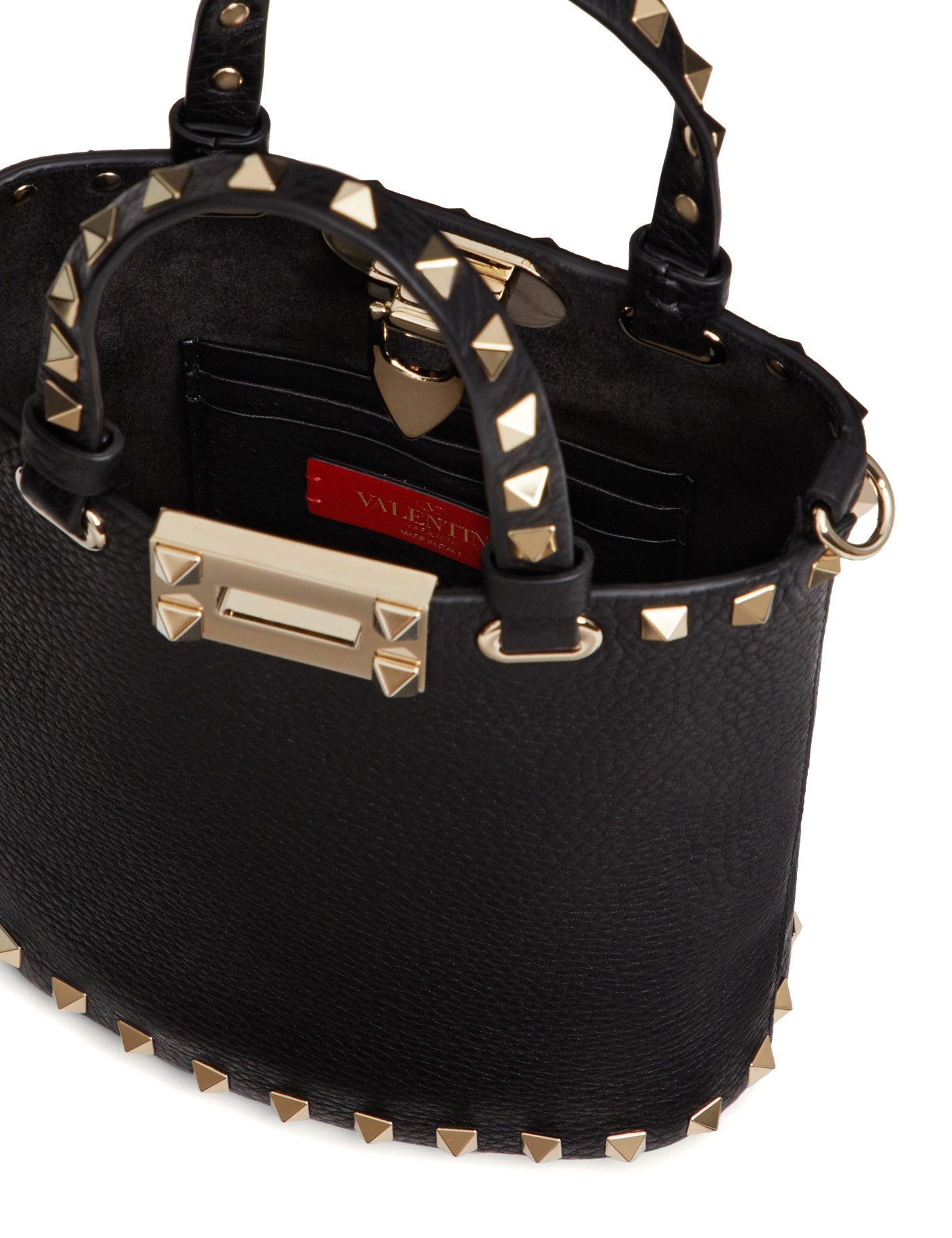 Calfskin Rockstud Handbag Valentino Garavani, two rigid handles on top, removable shoulder strap with iconic brand studs, iconic brand monogram press-stamped on back, front hook-and-eye closure, iconic Rockstud studs applied on beading, single interior compartment.