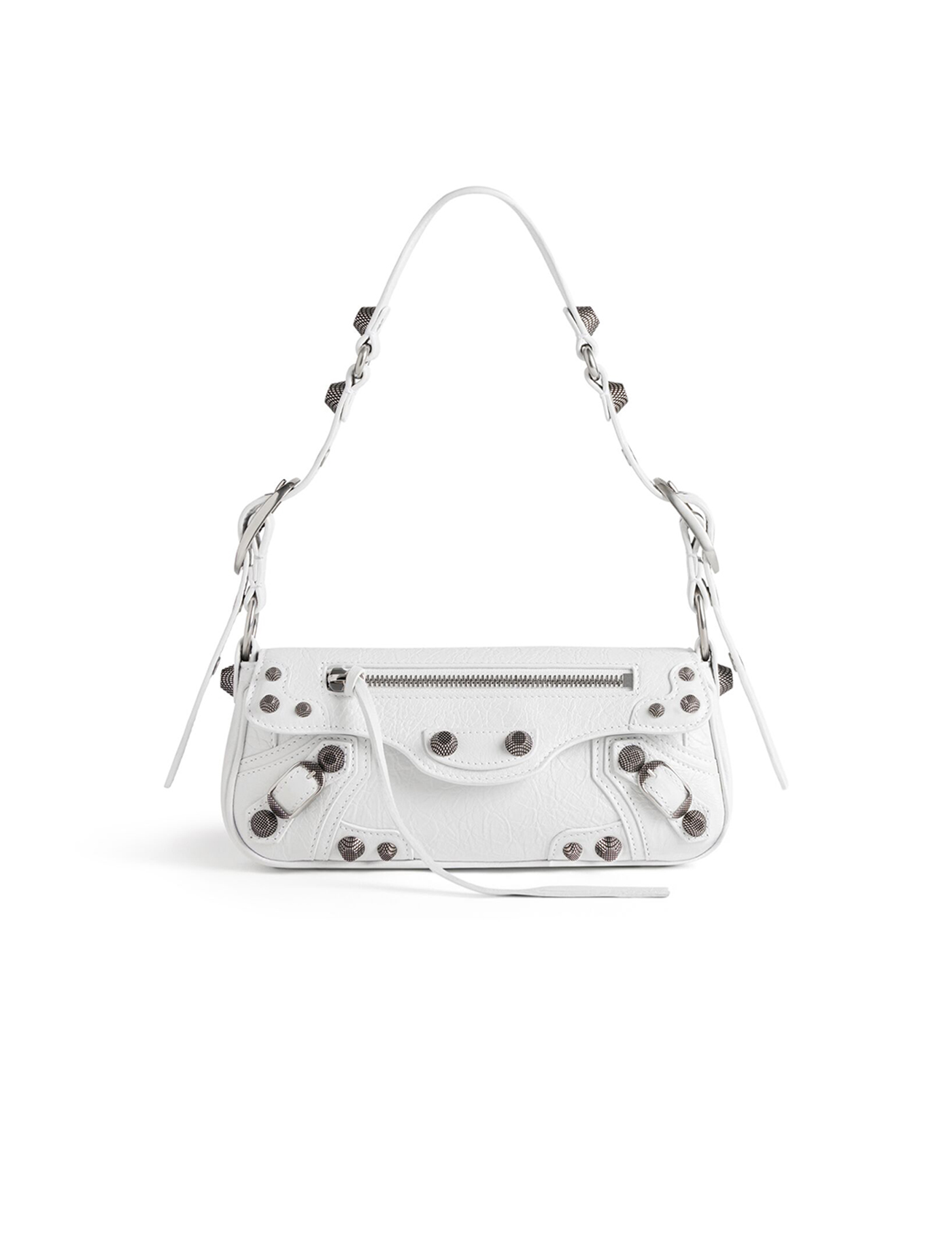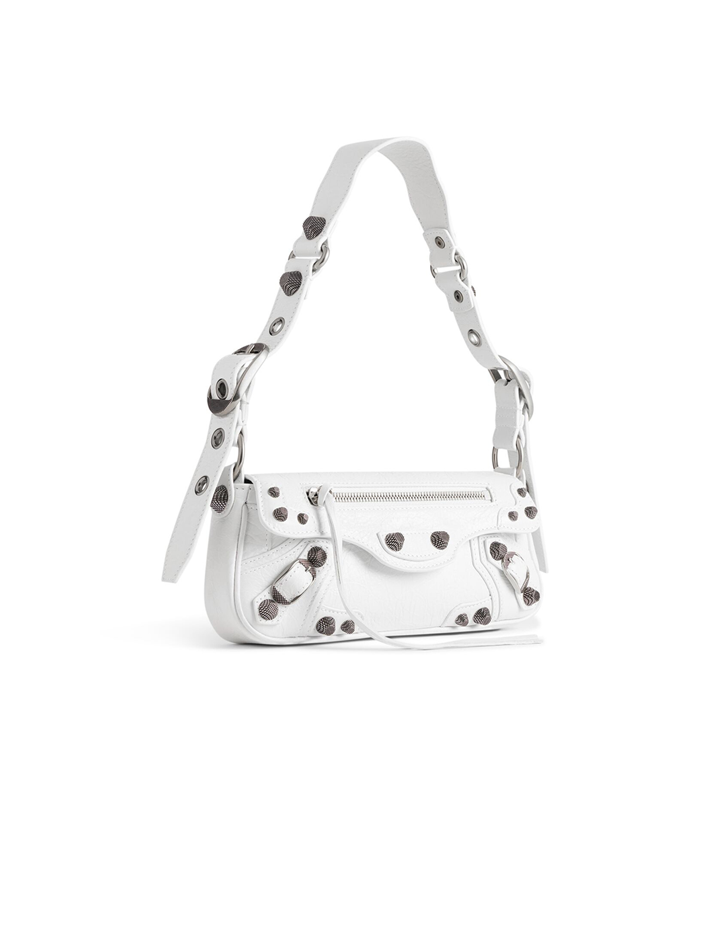 Lambskin Le Cagole Shoulder Bag by Balenciaga , removable and adjustable leather shoulder strap, flap with front closure, zippered welt pocket with knotted leather puller on flap, antique silver studded trim, zippered fieltto pocket on back panel.