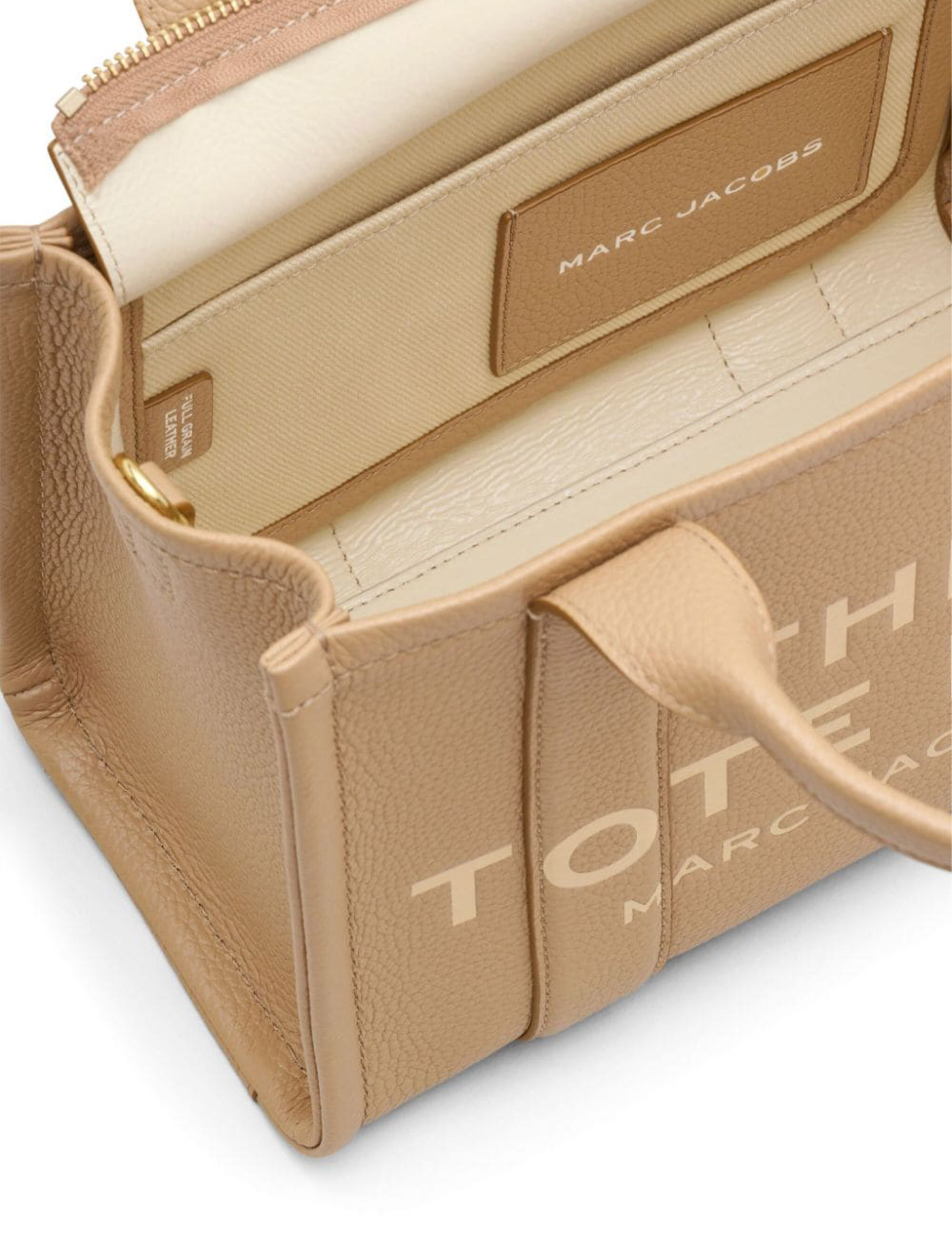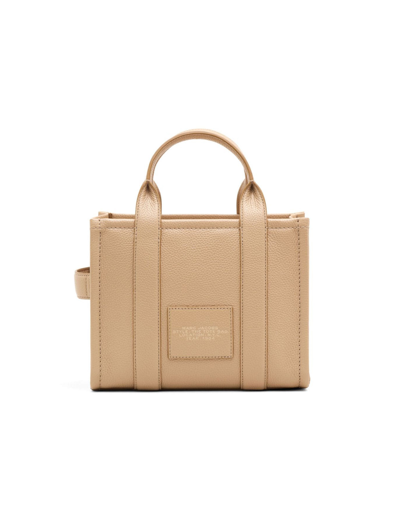 The Leather Small Tote handbag by Marc Jacobs, made from hammered camel-colored leather. Embossed logo on the front, gold metal details, interior with pocket pouch. Zip closure. Adjustable and removable shoulder strap. Measurements 26x13x21 cm.