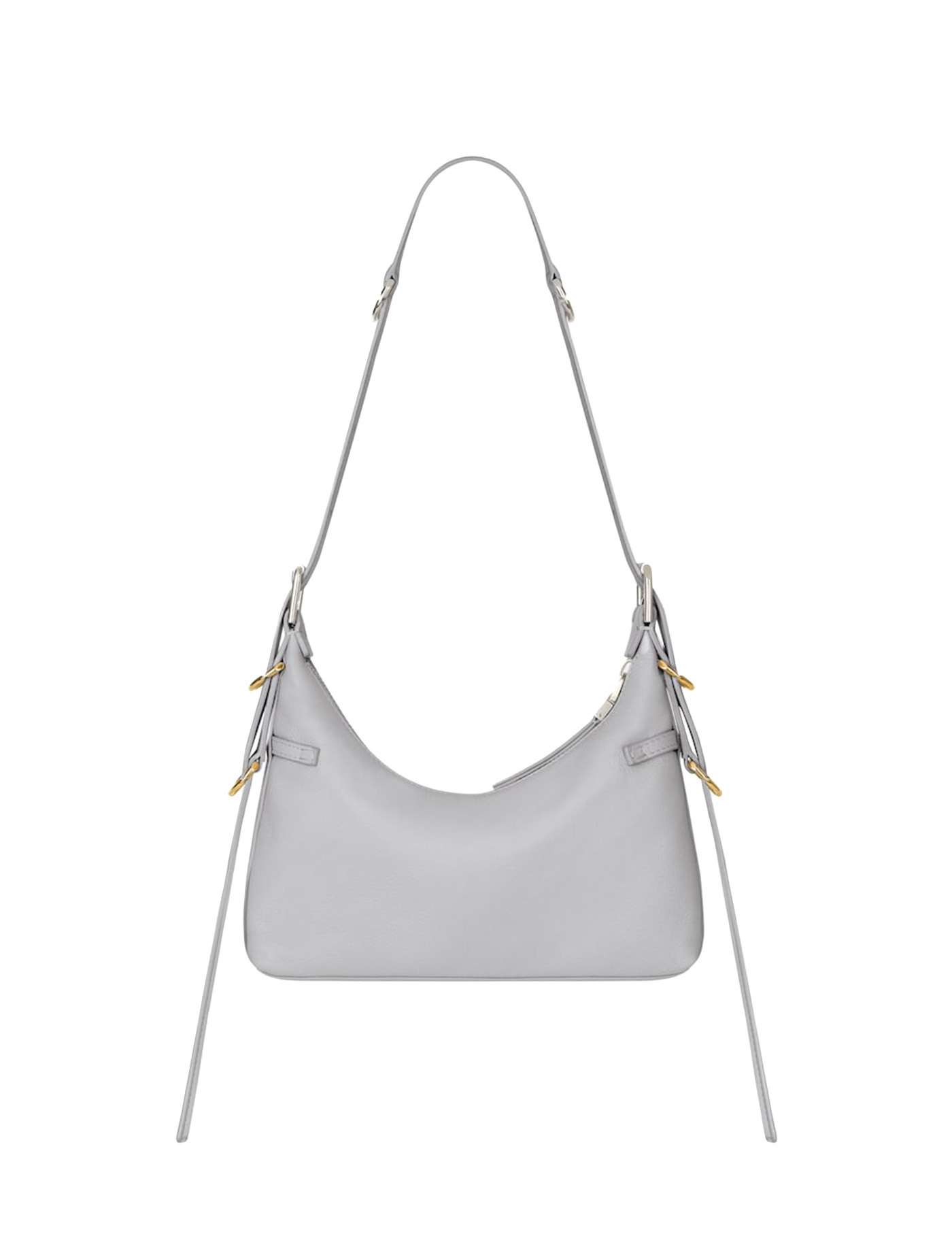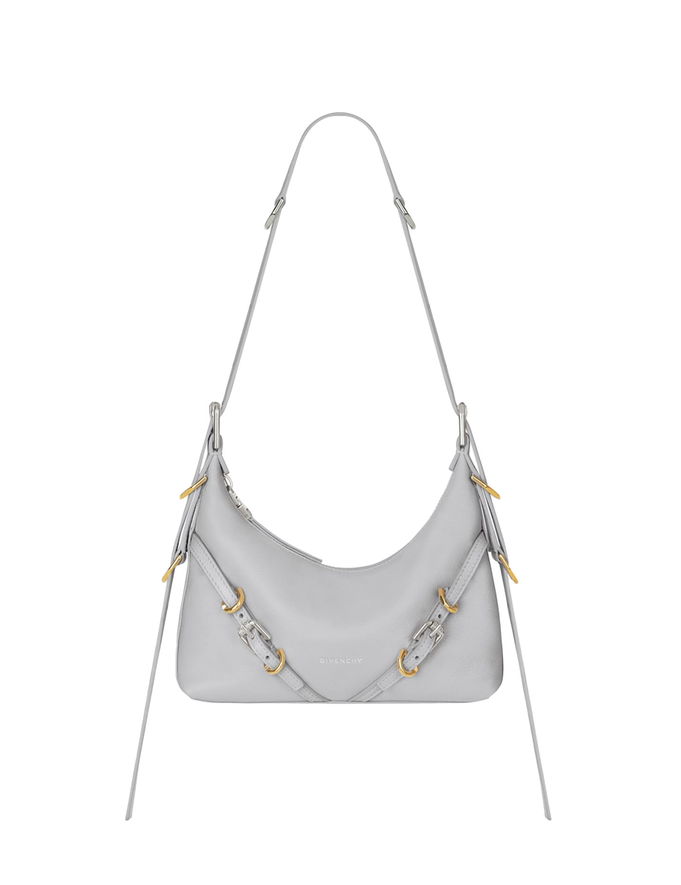 Calfskin Voyou Shoulder Bag by Givenchy, adjustable flat shoulder strap at top, top zipper closure, adjustable leather buckle detail applied to front, single interior compartment, iconic brand signature press-stamped on front, interior welt pocket, gold-plated details and trim.