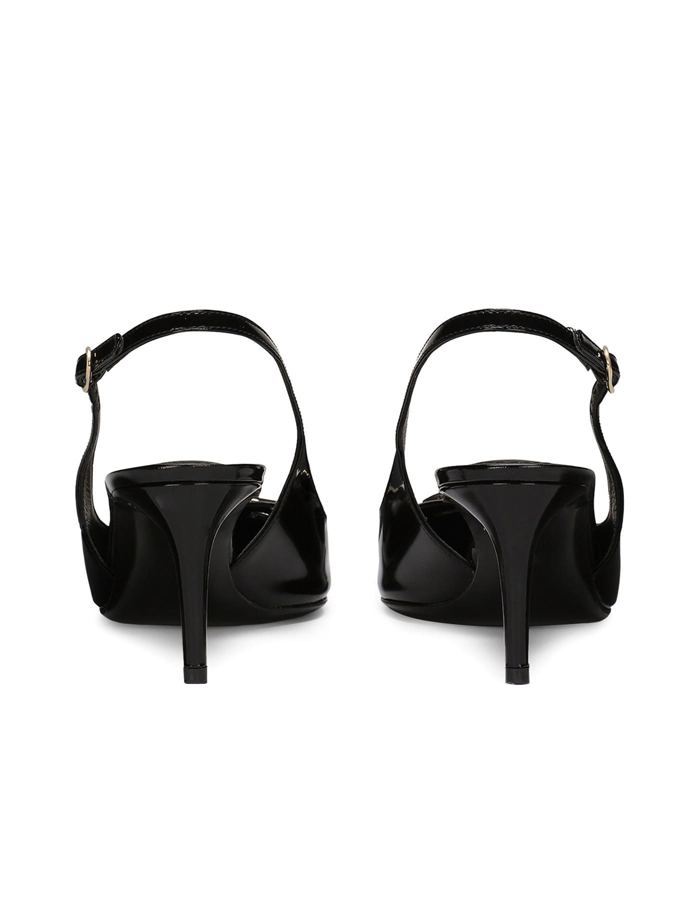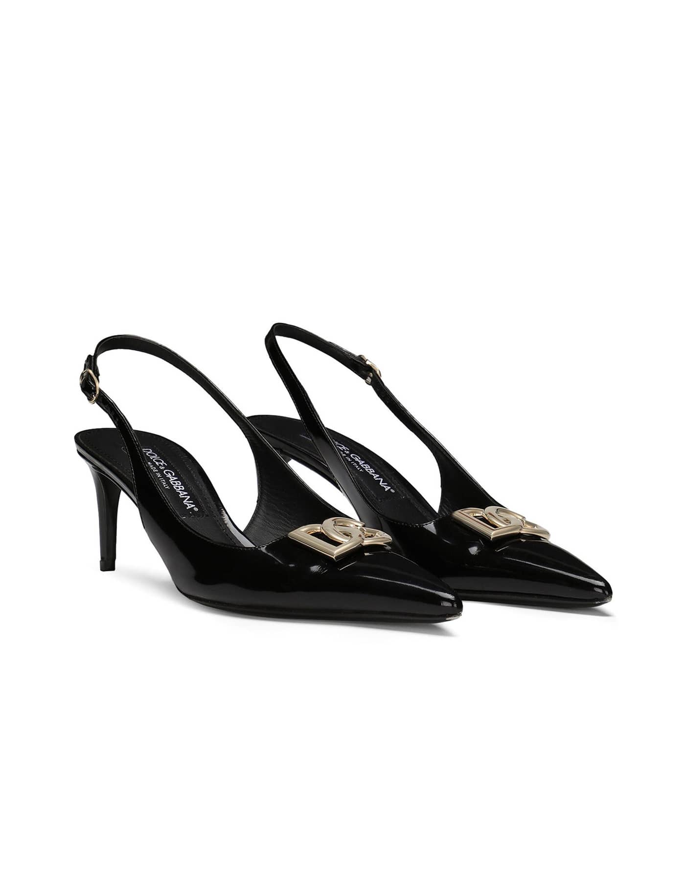 Slingback in black shiny calfskin with gold-tone metal DG logo on the front. They feature pointed design, adjustable ankle strap, thin heel and leather sole.