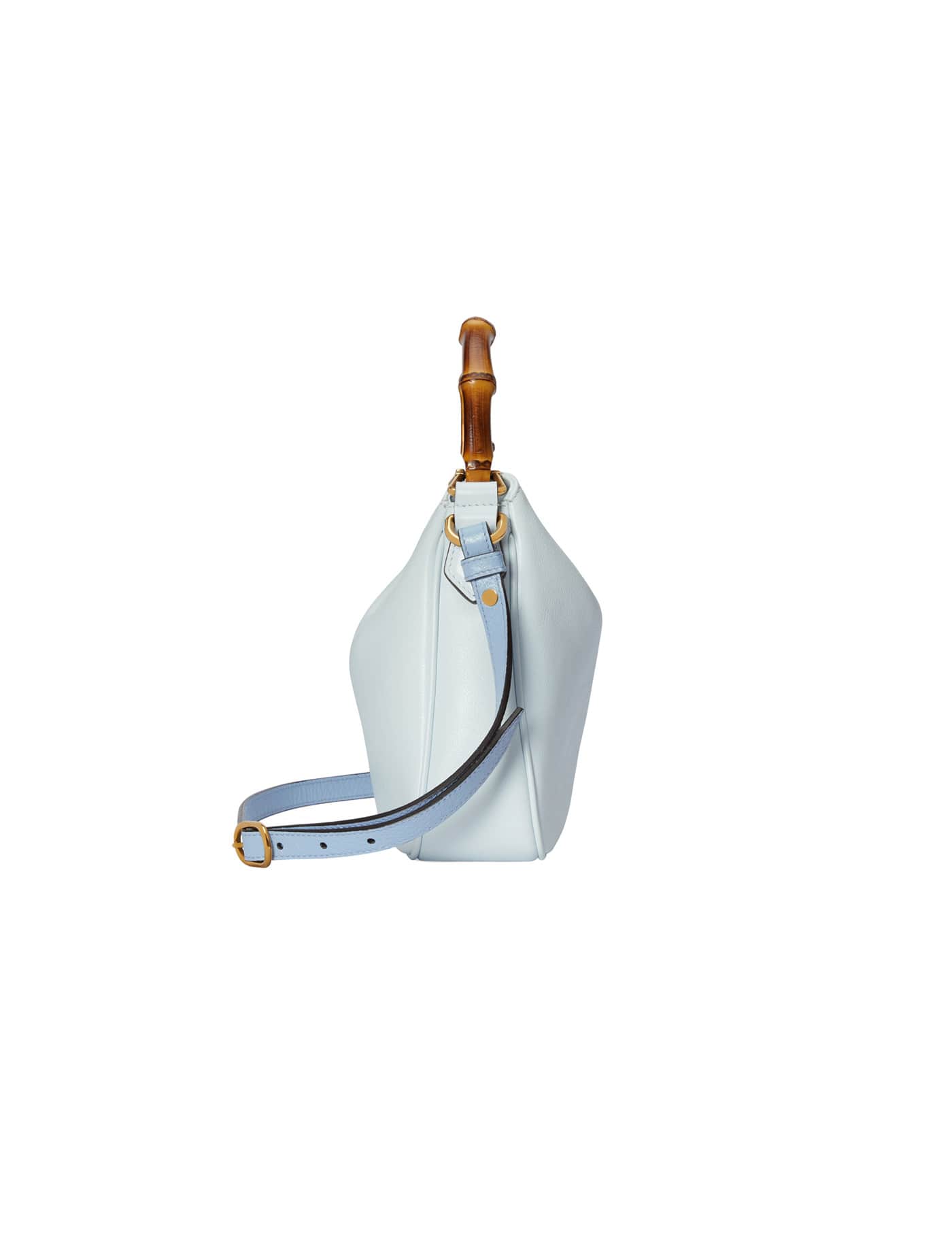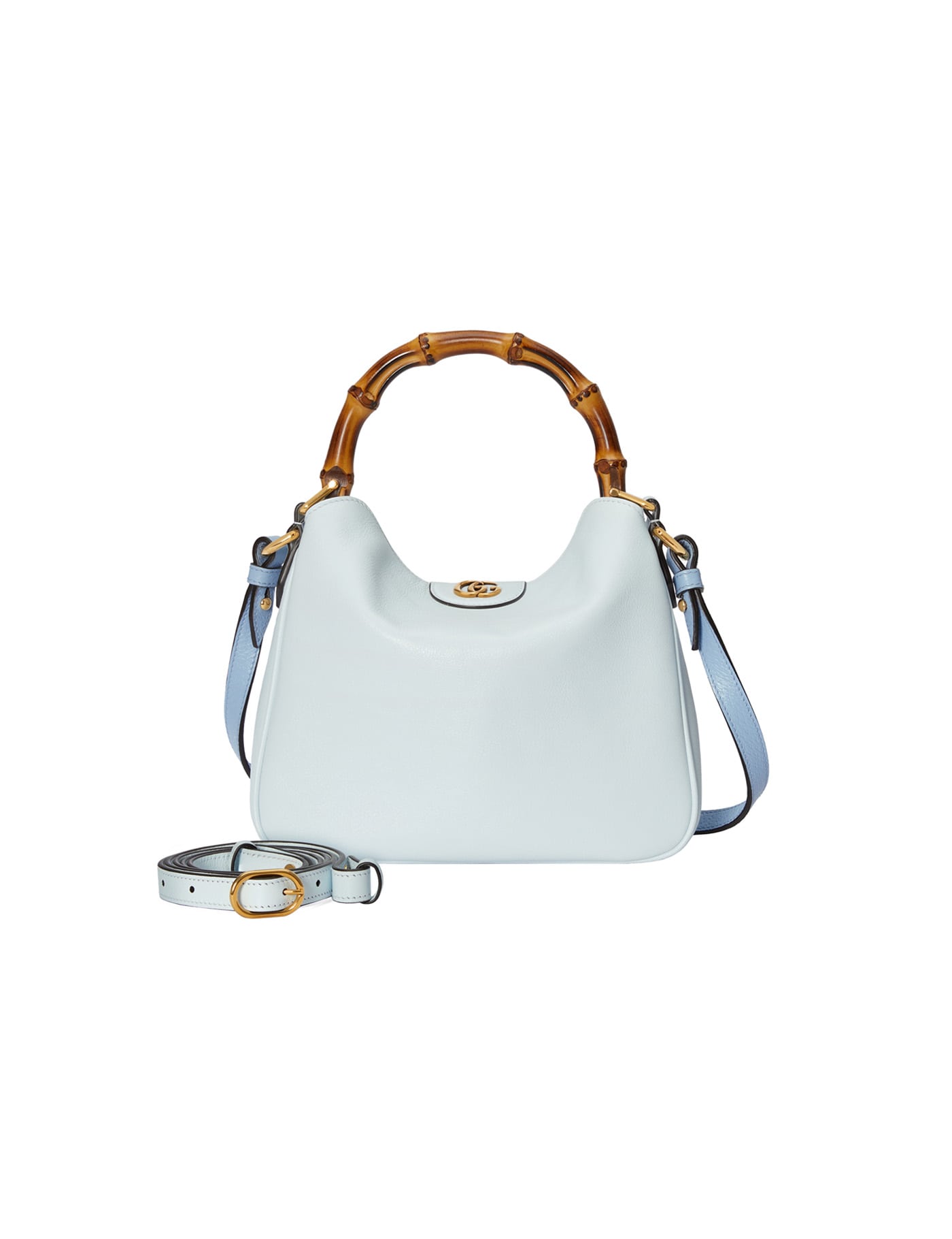 Calfskin Mini Diana Handbag by Gucci featuring a bamboo top handle, magnetic top closure, the brand's iconic GG logo plaque applied in a contrasting, embossed pattern on the front, an interior welt pocket, an adjustable and removable flat leather shoulder strap, and a single interior compartment.