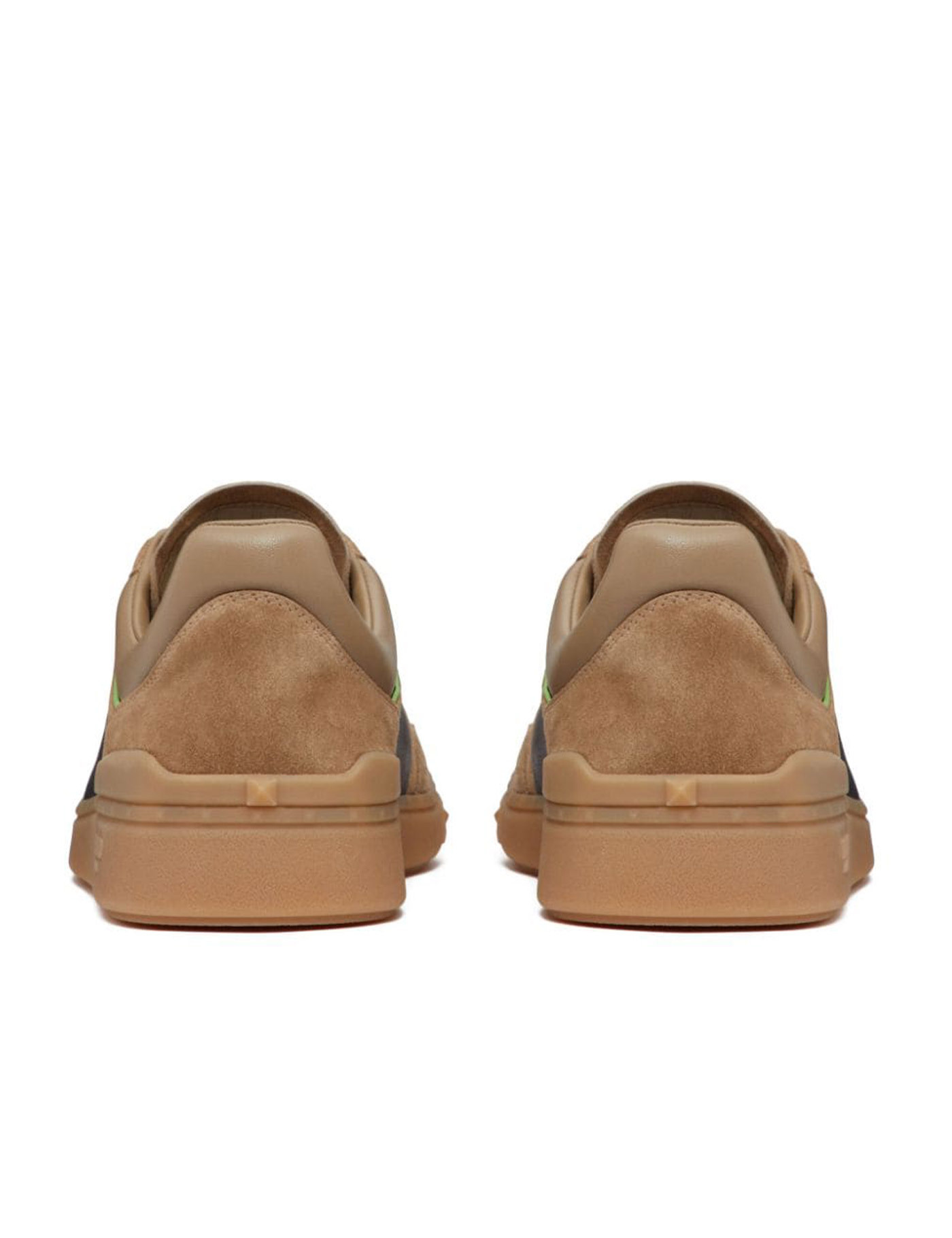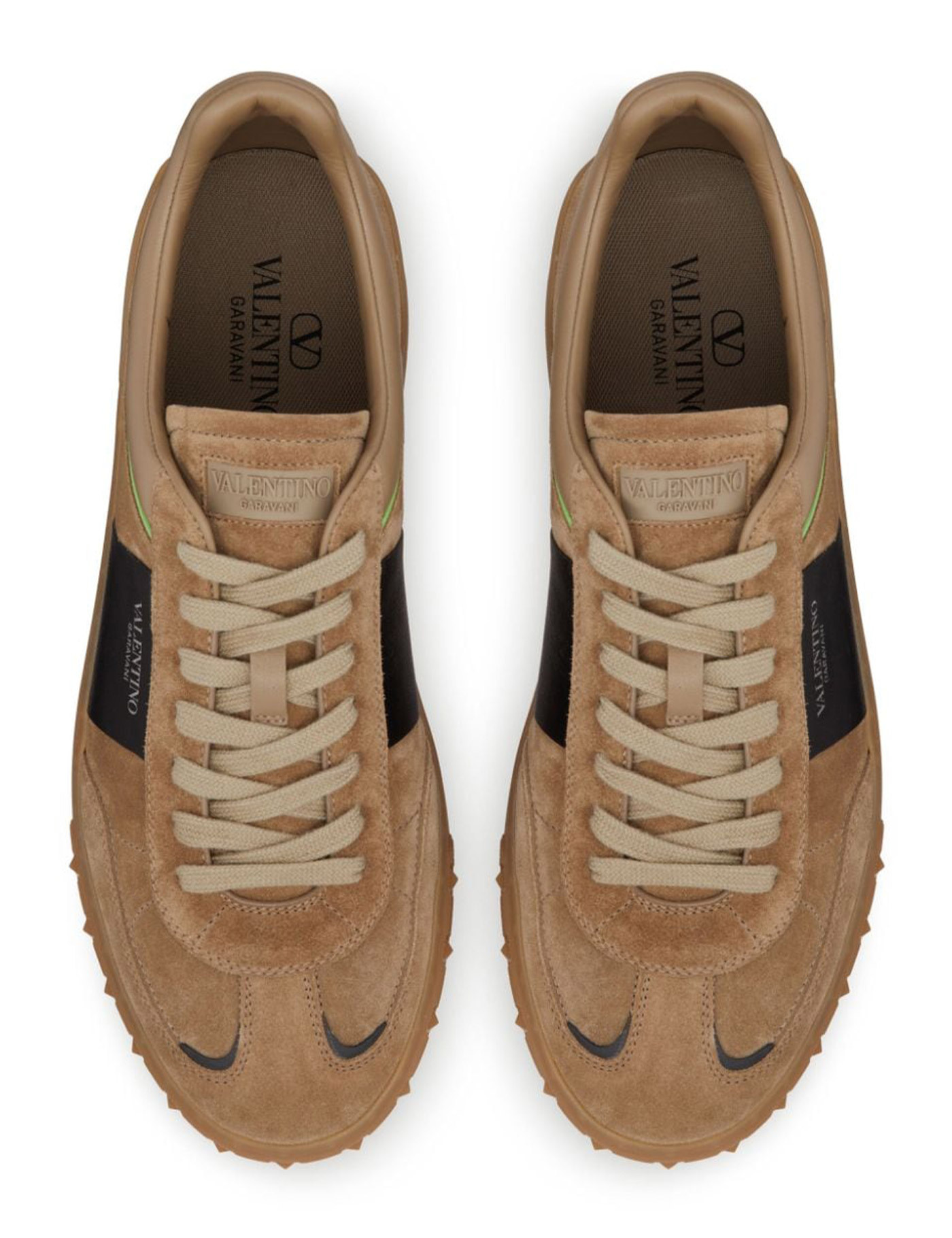 Calfskin Highline Sneakers by Valentino Garavani, featuring a flat rubber sole, a lace-up front closure, a round toe, a suede leather design, an iconic brand monogram on the front tongue, a slanted band with an iconic brand monogram on the outer side panels.