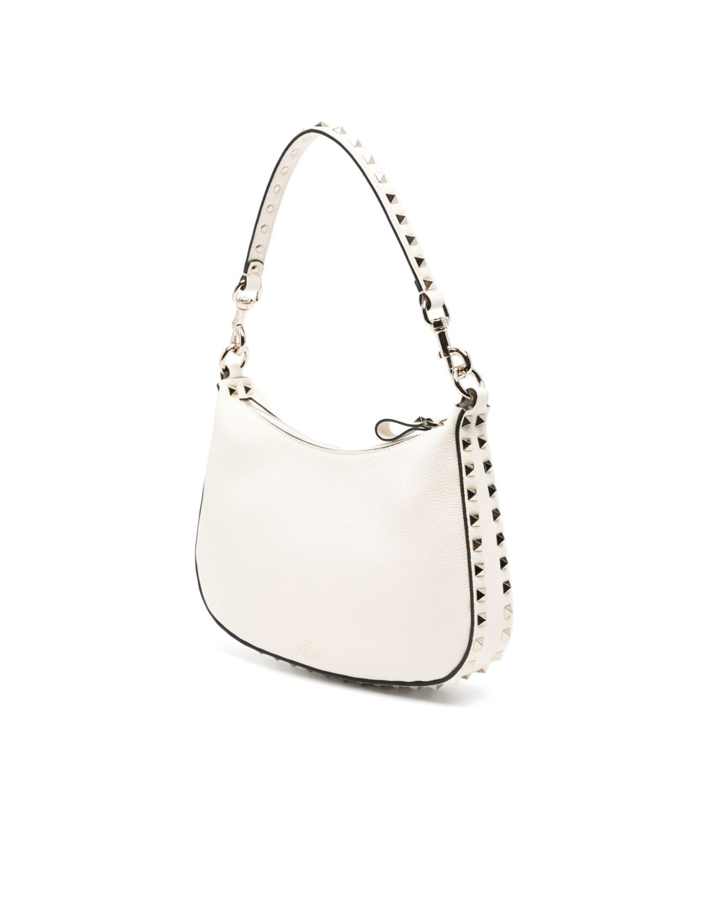 Calfskin Rockstud Shoulder Bag by Valentino Garavani, hobo design, removable shoulder strap via snap hooks, removable and adjustable flat shoulder strap, iconic brand Rockstud studs applied to all-over profiles, top zipper closure, iconic brand monogram stamped on back, interior slit pocket.