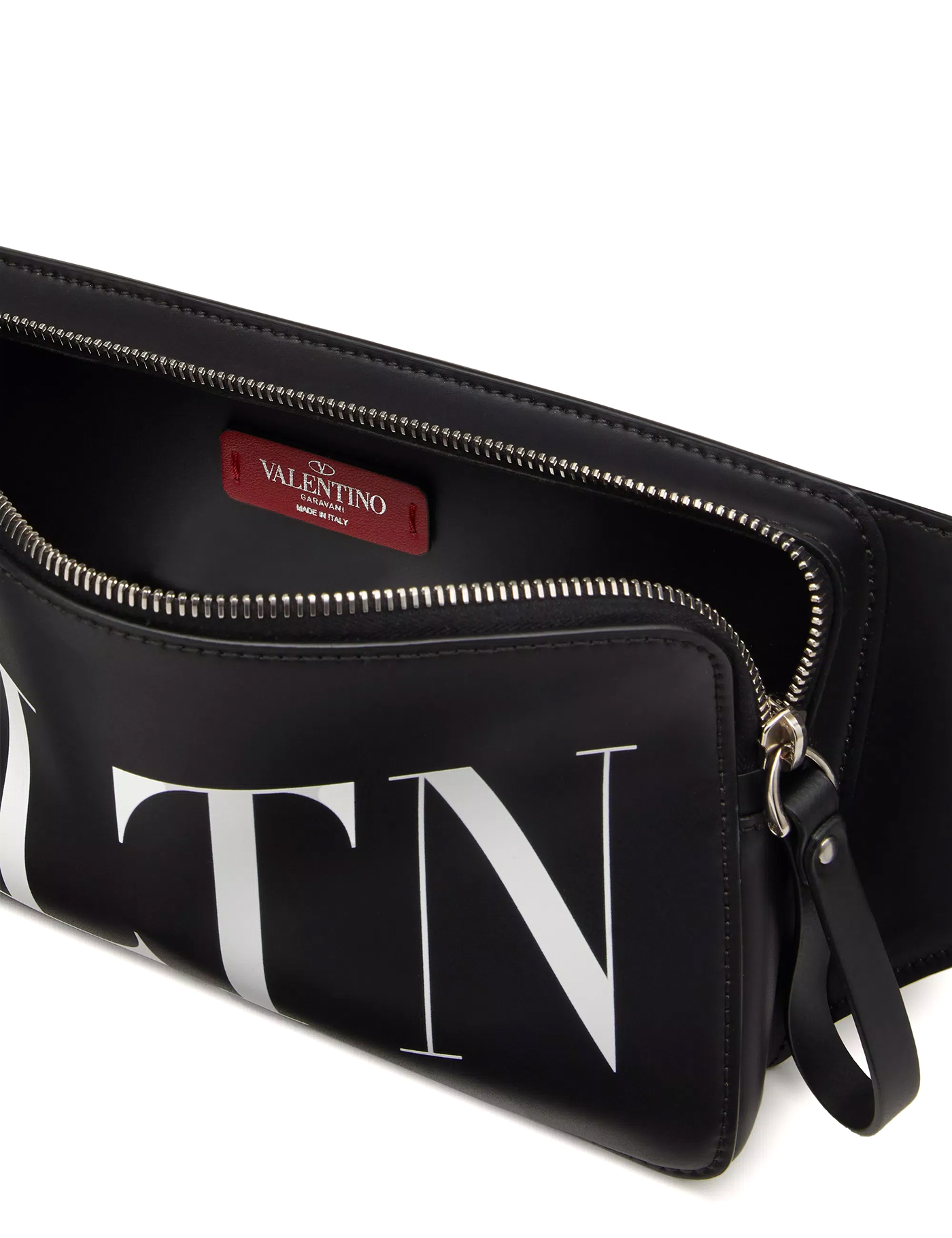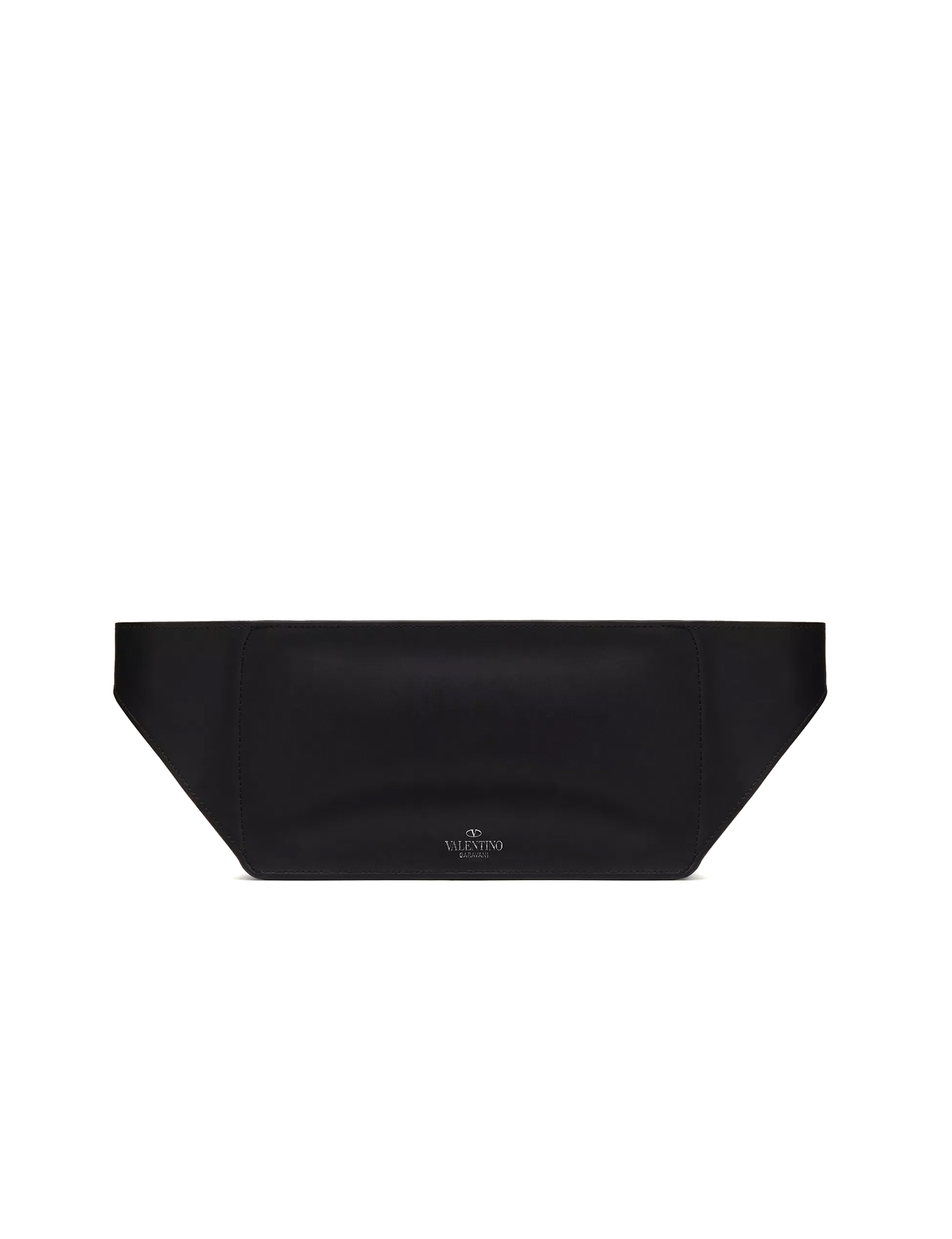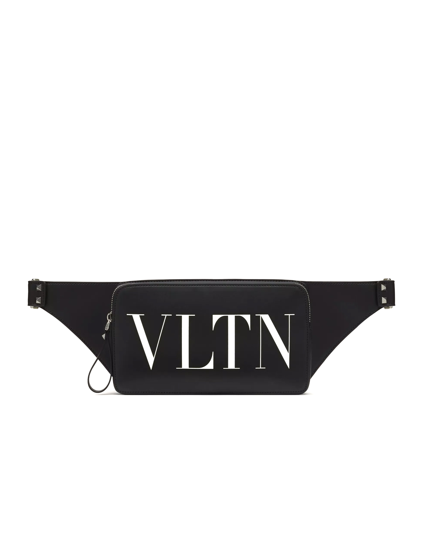Calfskin VLTN Fanny Pack by Valentino Garavani, top zipper closure, iconic VLTN logo printed in contrast at front, slider embellished with iconic rockstud stud, single internal compartment, iconic brand monogram in contrast at back, adjustable buckle belt.