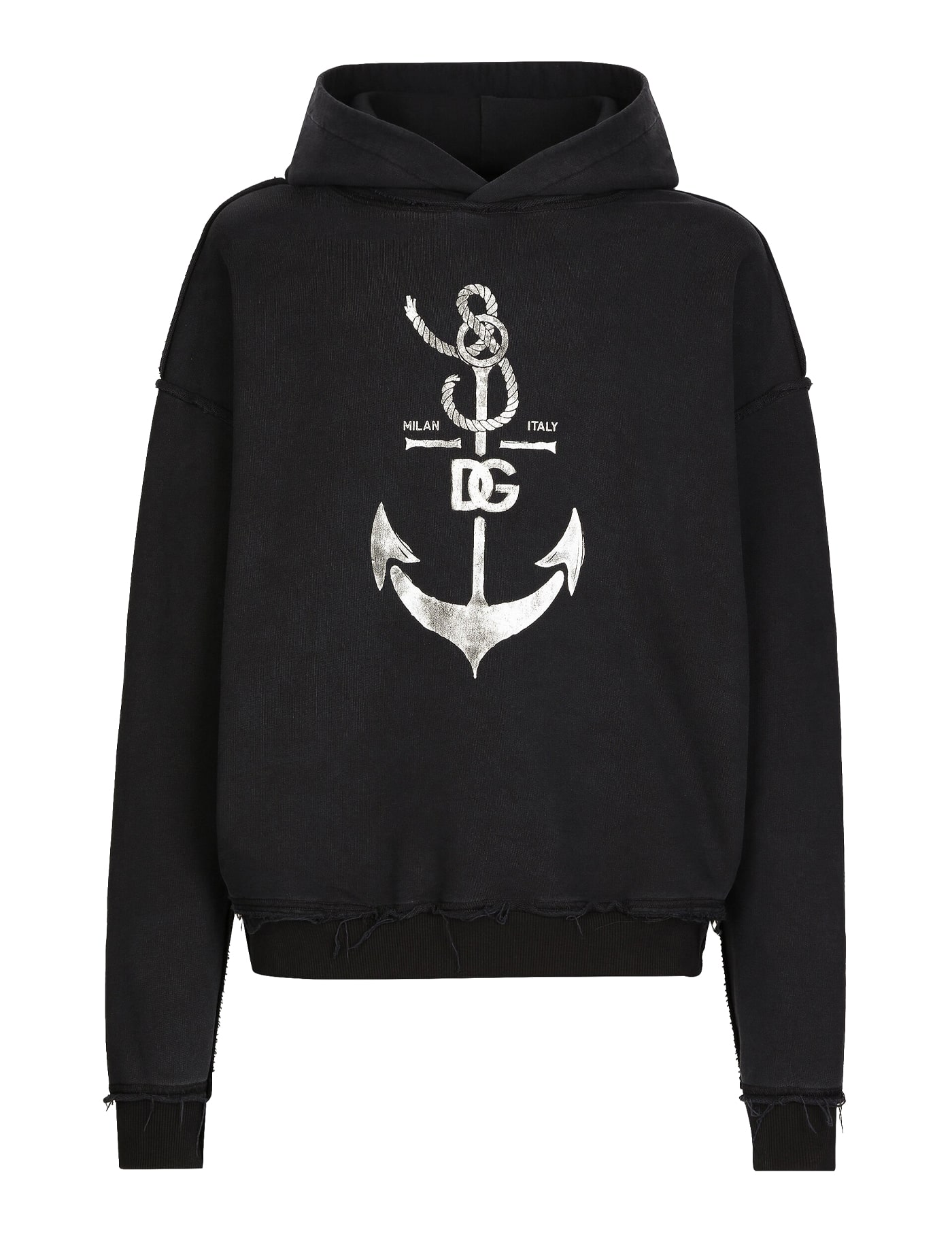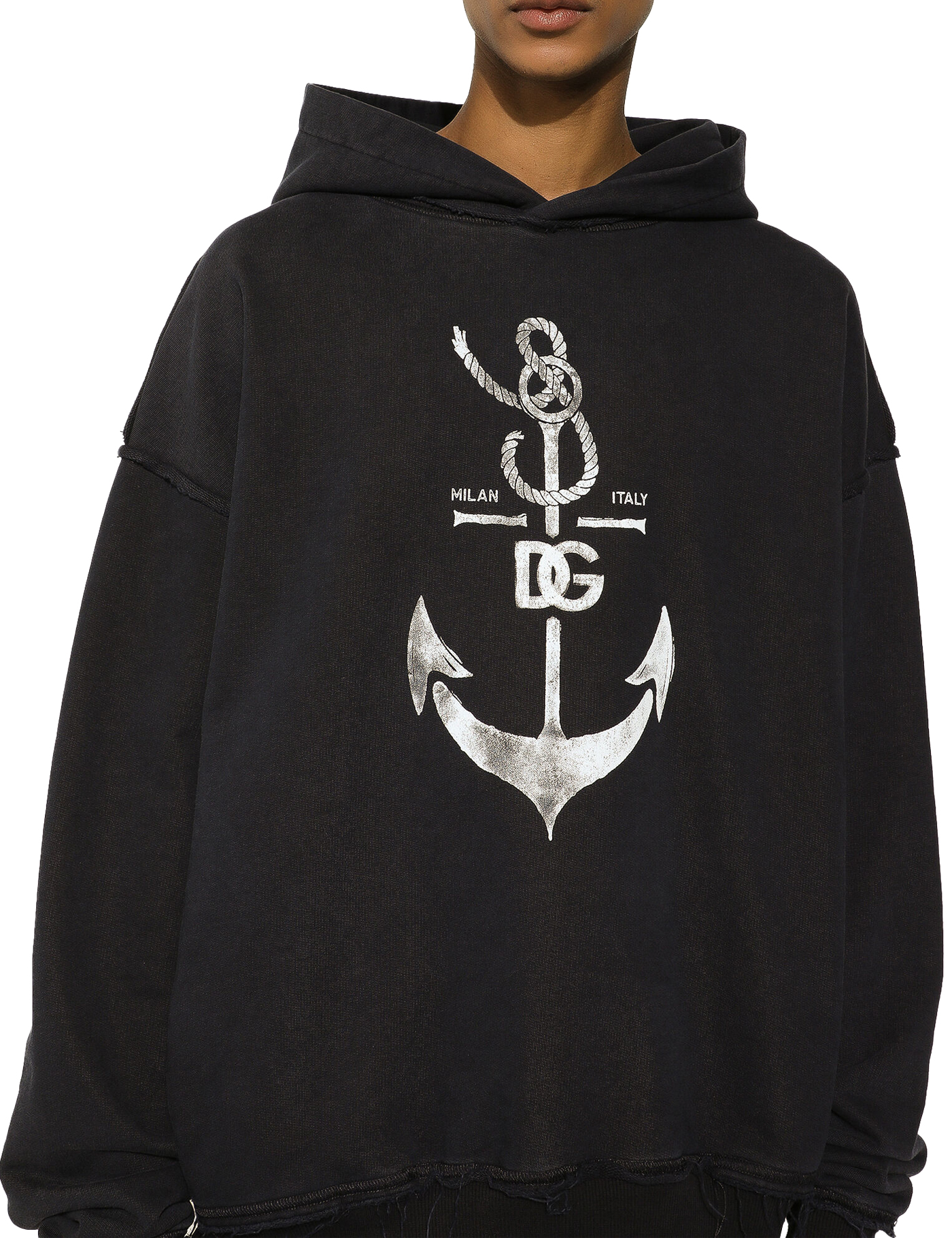 Blue cotton jersey hoodie with Marina print. It features two side welt pockets and raw-cut outer seams. Ribbed cuffs and hem. Oversized fit.