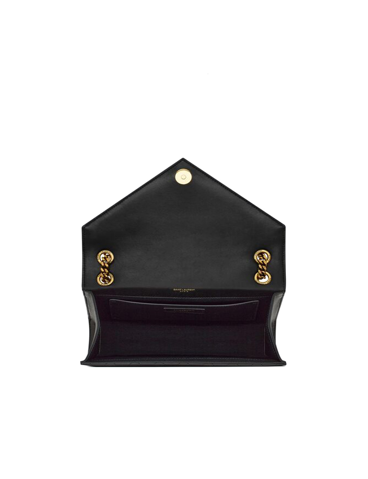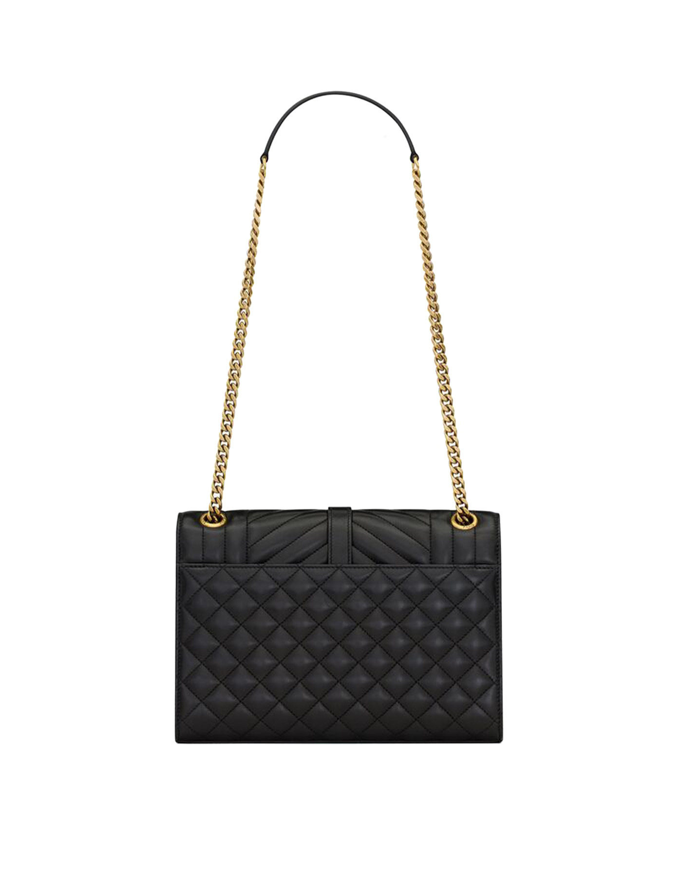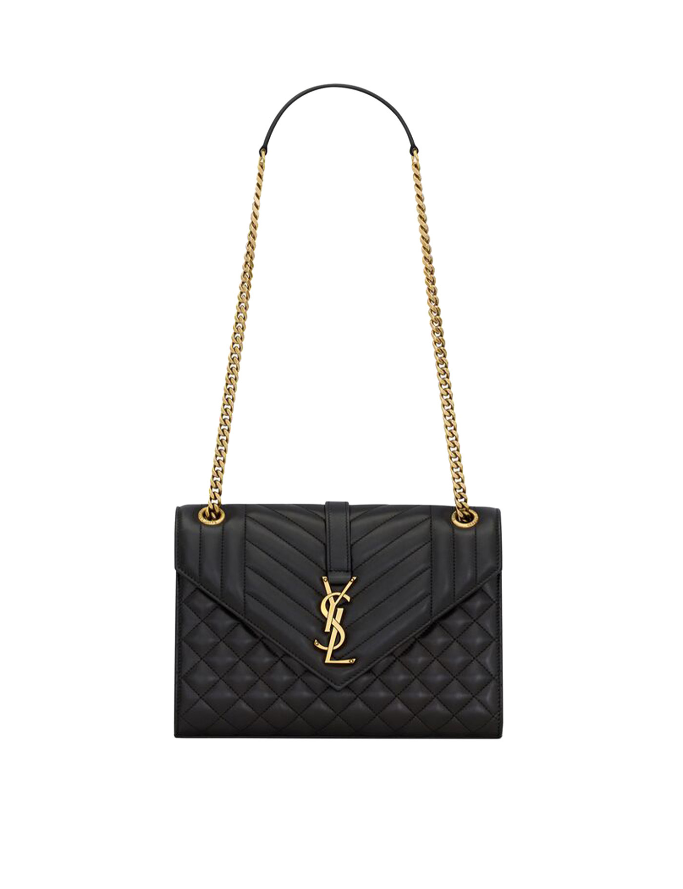 Medium Envelope bag in black matelassé lambskin with bronze-colored YSL monogram on the front. It features fixed top handle, chain shoulder strap, magnetic closure, one main interior compartment and one interior slip pocket.