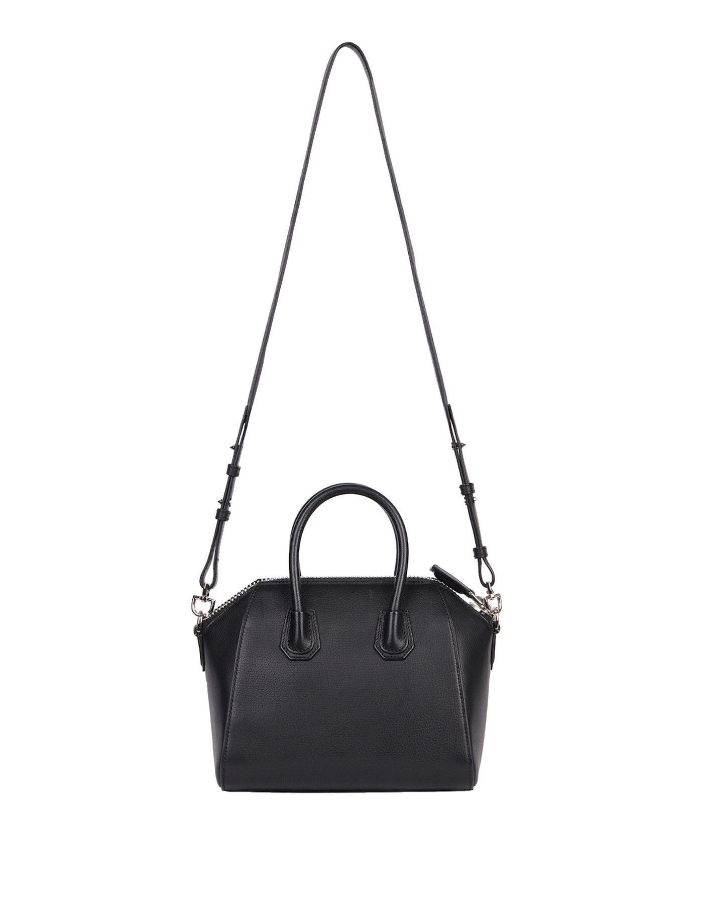 Calfskin Mini Antigona Handbag by Givenchy, shiny leather effect design, geometric pattern, two rigid top handles, top closure by zipper with double slider, contrasting iconic brand monogram on front, adjustable and removable shoulder strap, attached support feet at base of bag.