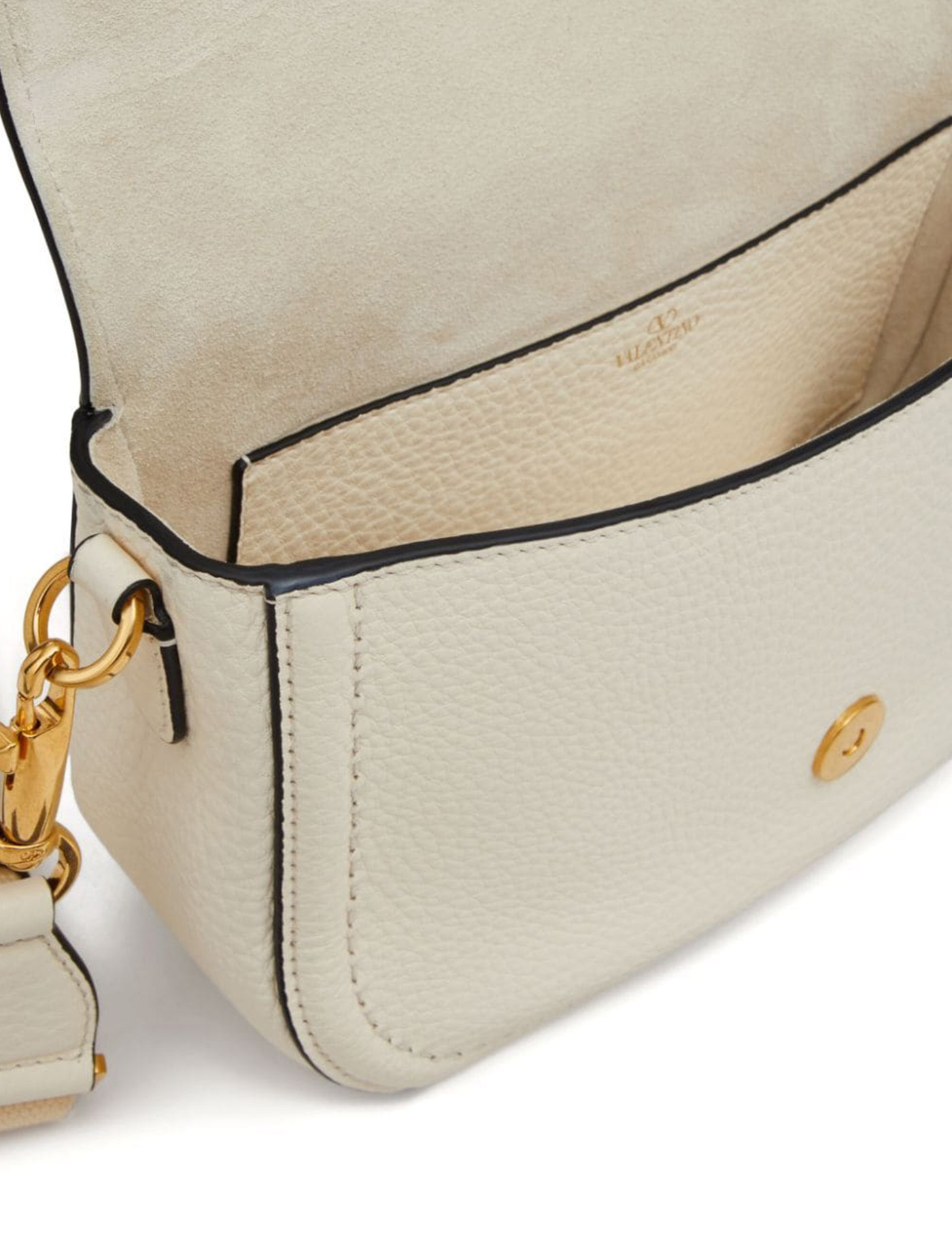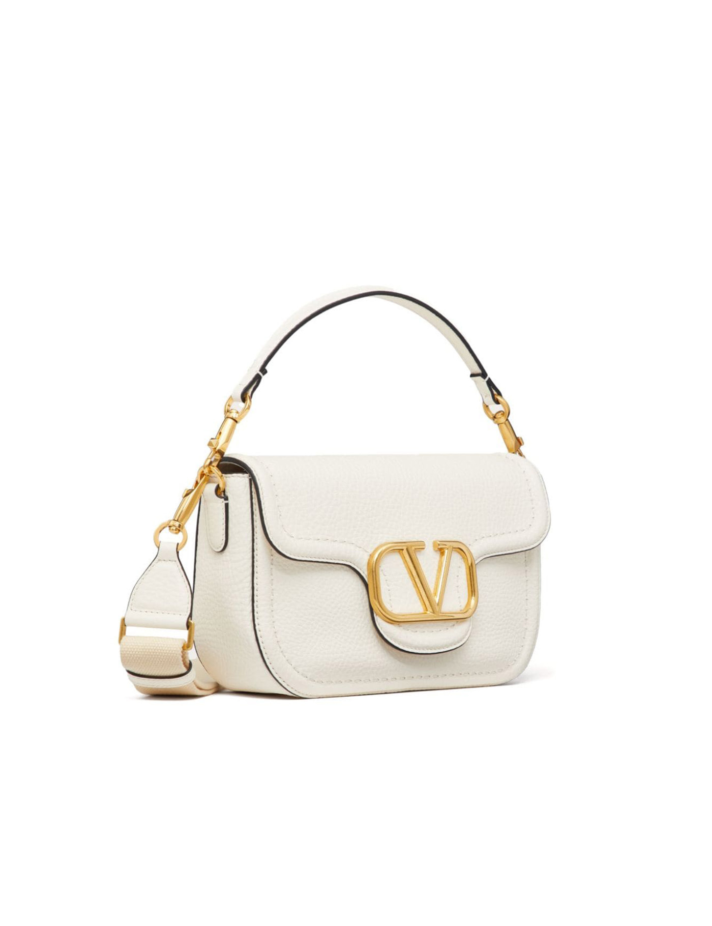 Valentino Garavani Alltime shoulder bag in white grained calfskin with gold-tone metal VLogo Signature detail. It features detachable top handle, adjustable and detachable ribbon shoulder strap, magnetic closure, one main interior compartment and one interior slip pocket. One rear flat pocket.