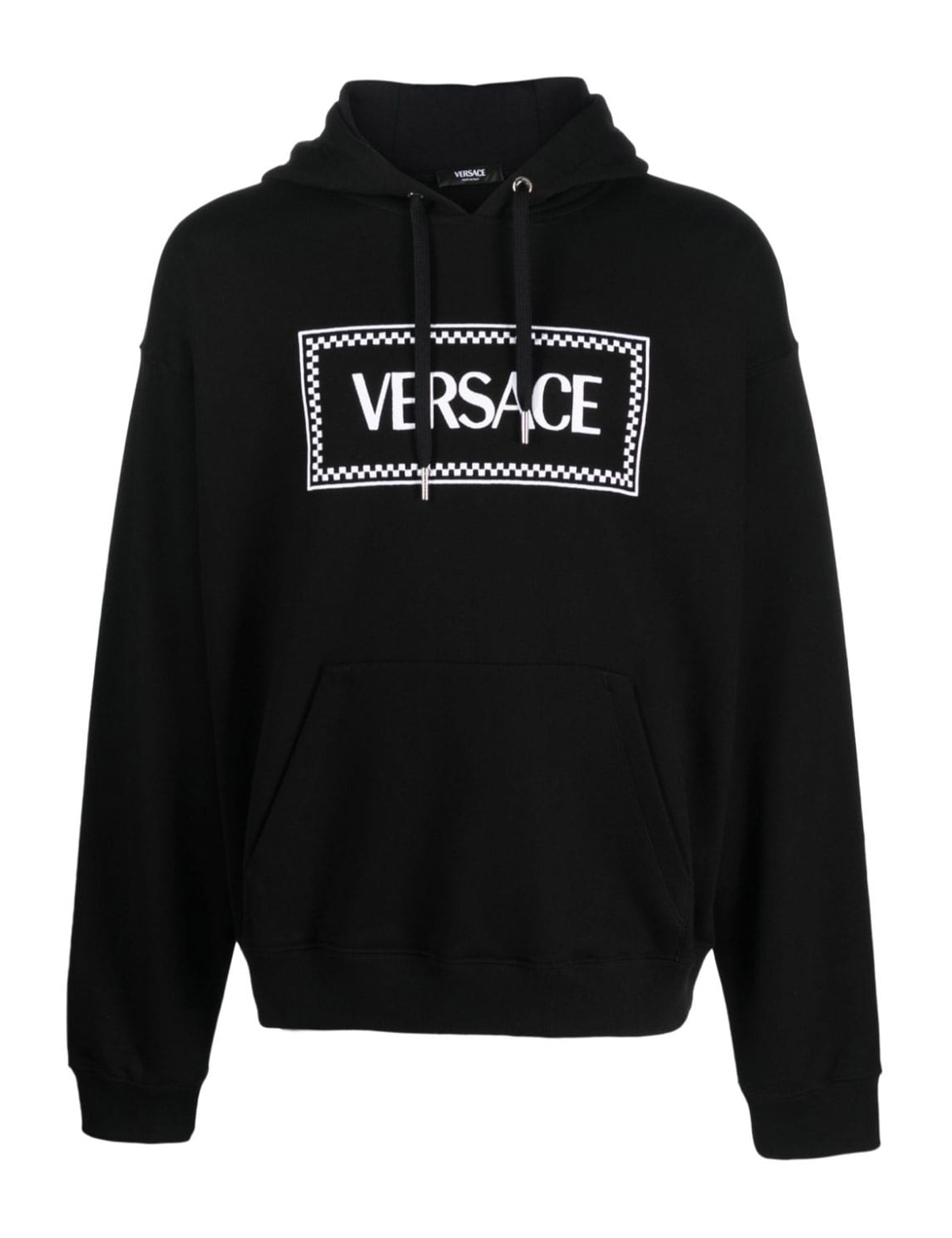 Cotton Hoodie by Versace, features hood with adjustable drawstring, ribbed cuffs, ribbed hem, front kangaroo pocket, iconic brand monogram printed in contrast on front, monochrome pattern, regular fit.