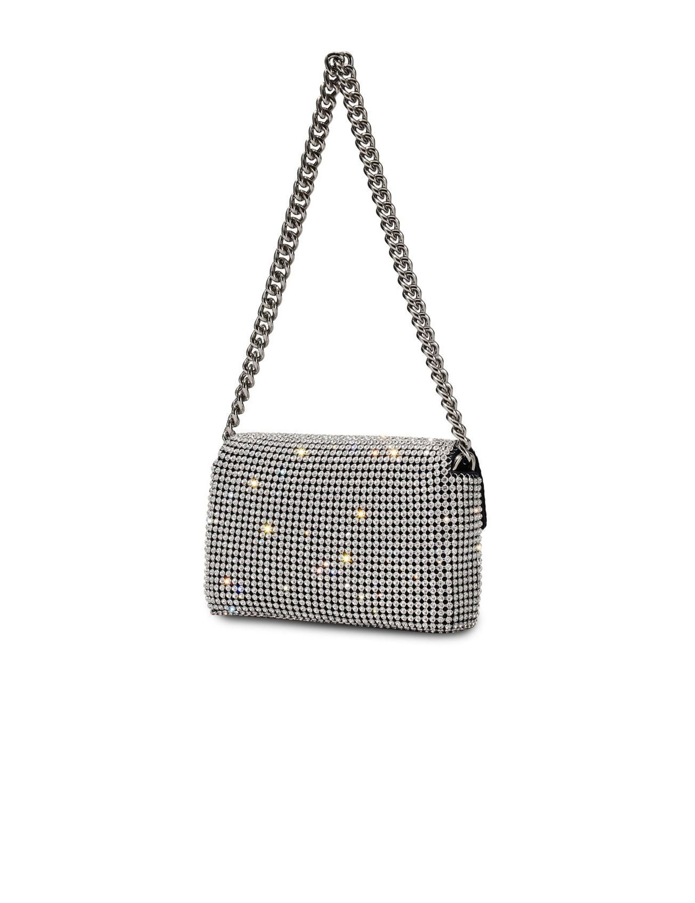 The Rhinestone J Marc Mini bag by Marc Jacobs is made of leather covered with a metallic mesh with silver rhinestones. The interior features card compartments, a silver metal chain shoulder strap, and a magnetic closure with an iconic logo. Measures19x4x11 cm.