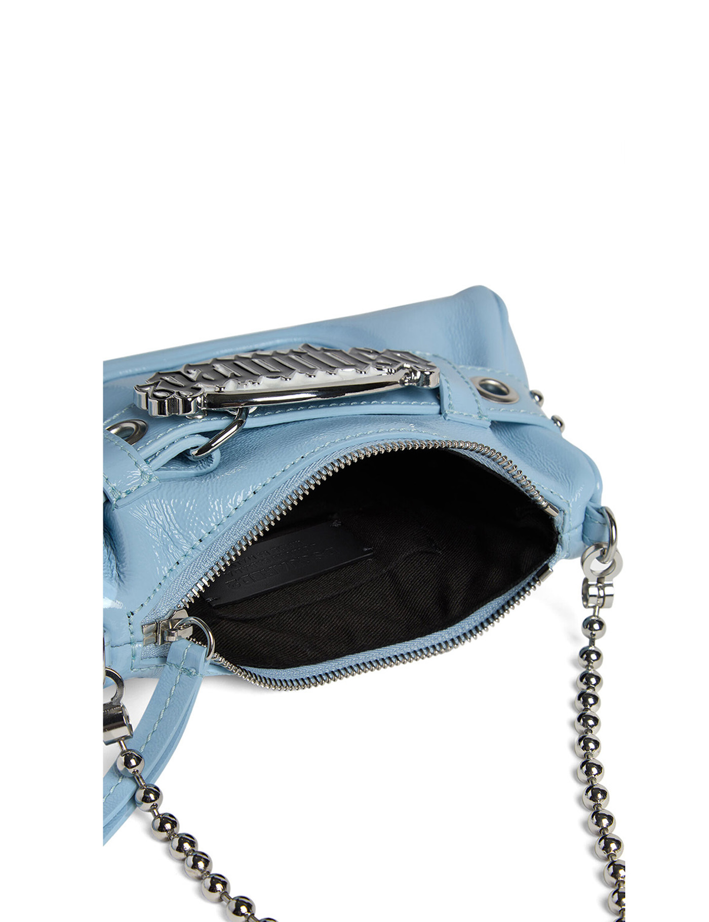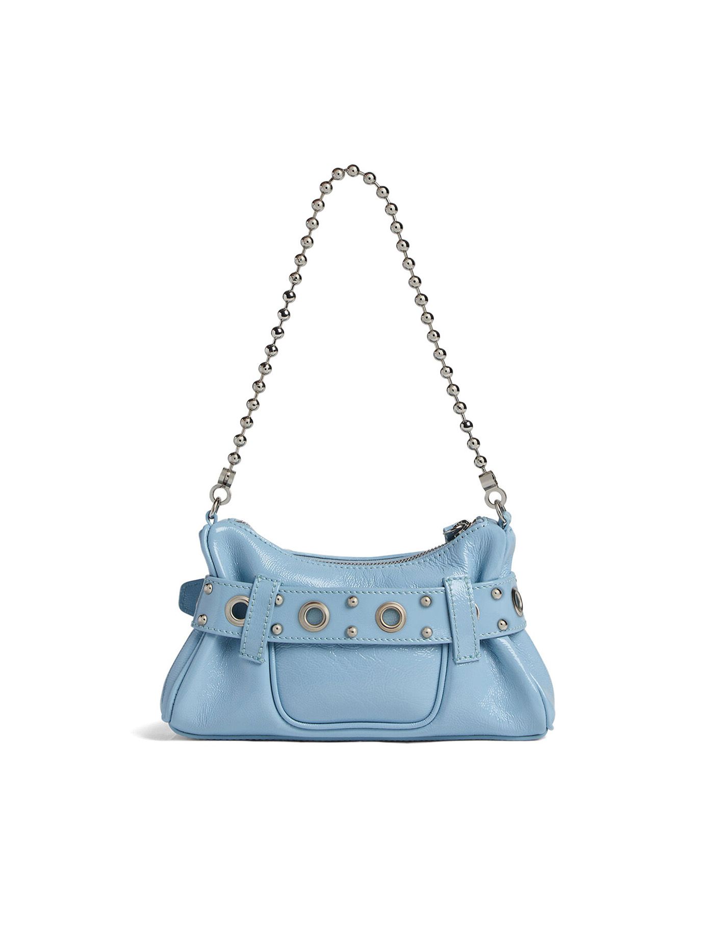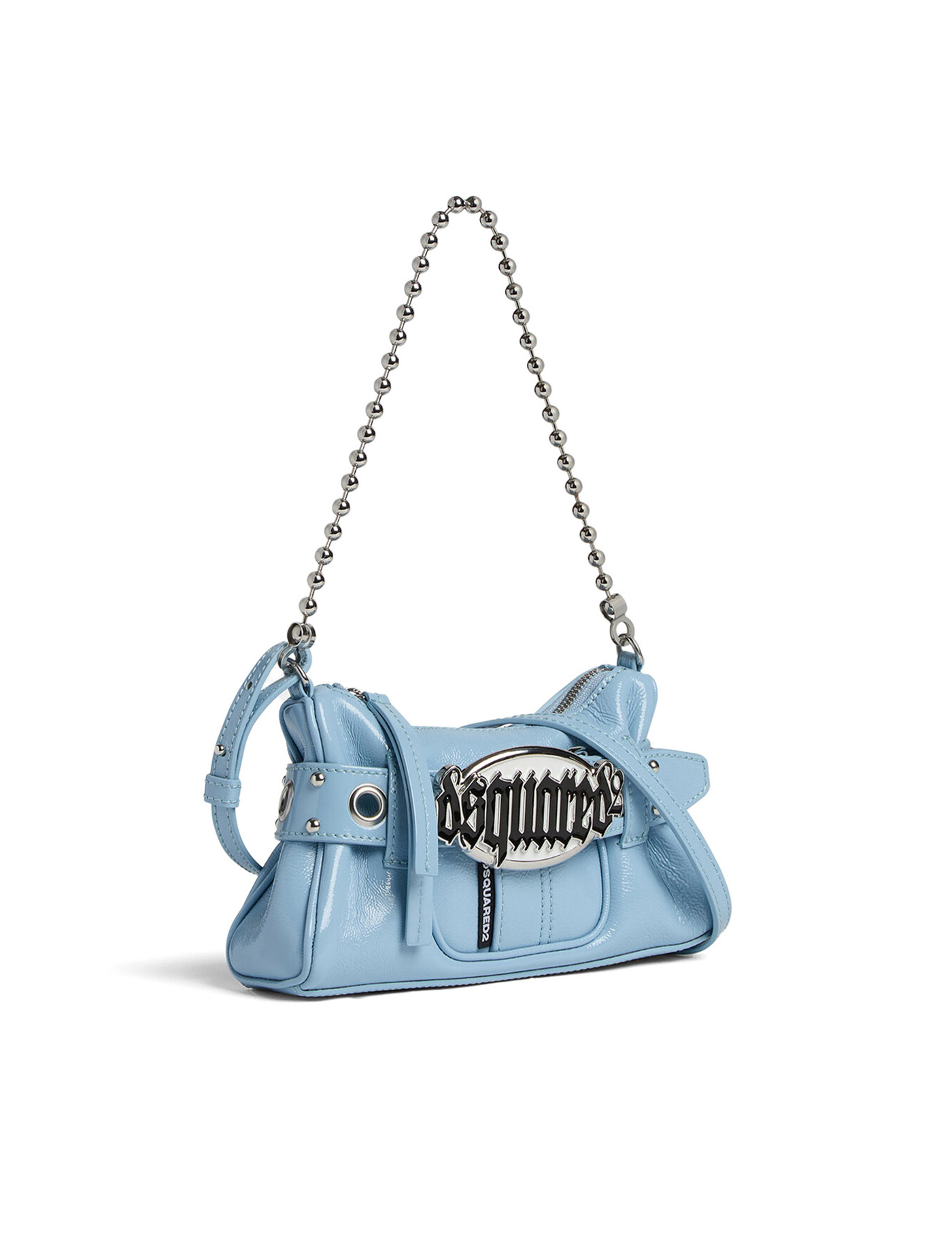 Calfskin Gothic Belt Shoulder Bag by Dsquared2, removable chain shoulder strap, top zipper closure, removable leather shoulder strap embellished with silver-tone studs, all-over applied belt loops, studded belt detail inserted in the loops, three-dimensional logo embossed plaque buckle applied to the front, interior welt pocket.
