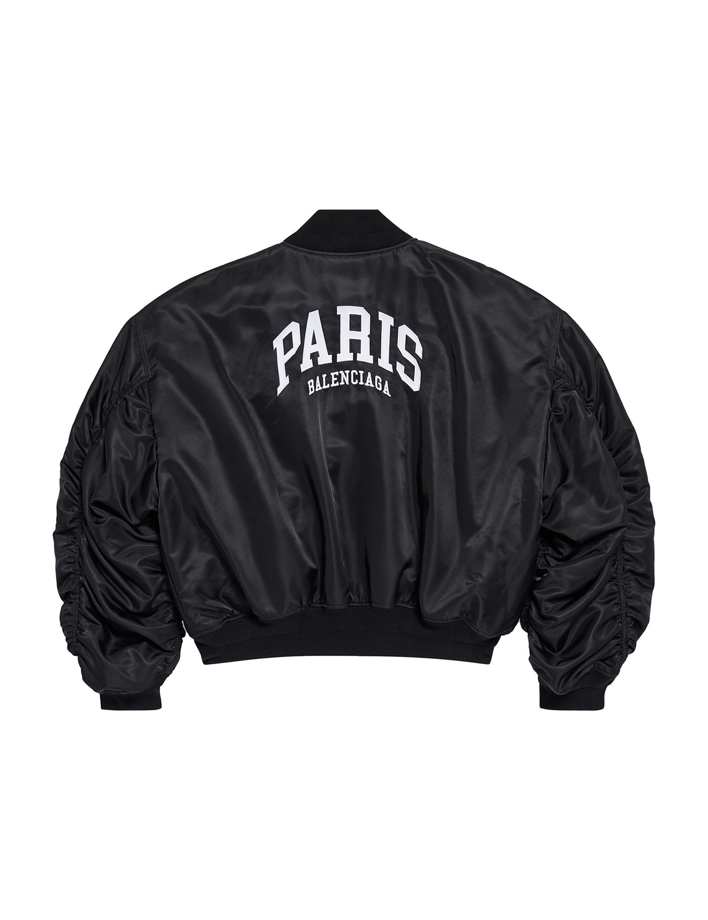 Varsity jacket in black nylon with Paris Balenciaga embroidery on chest and on the back. It features front press-stud closure, two side press-stud flap pockets and draped sleeves. Ribbed trims. Large fit.