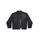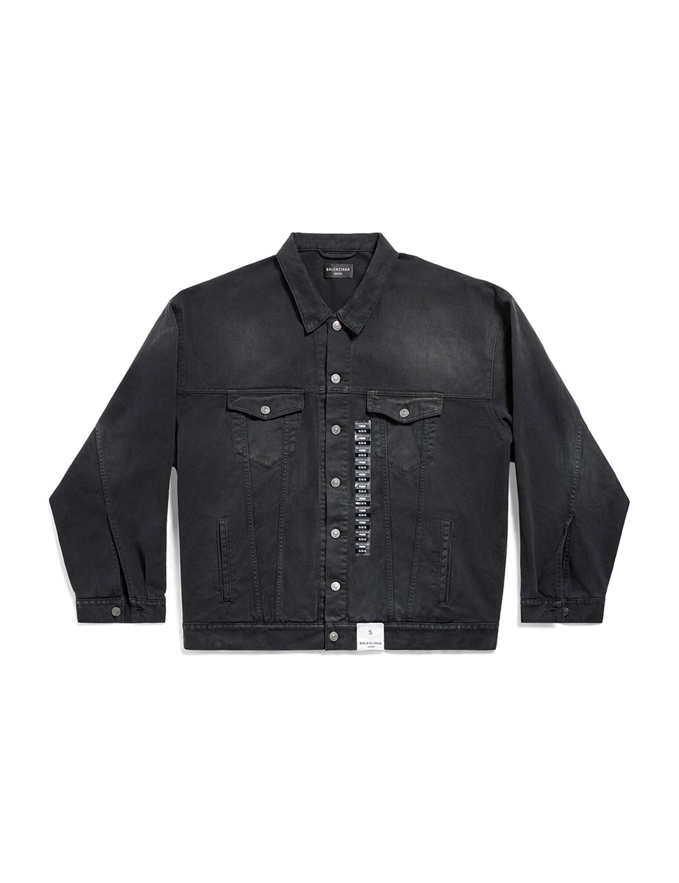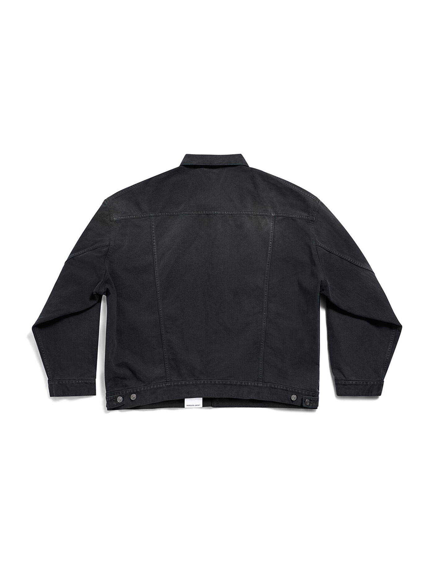 Soft black left hand denim jacket with Denim Size Sticker motif on the front and Denim Size Jacron motif on the front hem. It features classic collar, front button closure, two buttoned flap pockets on chest, two side welt pockets and buttoned cuffs. Oversized fit.