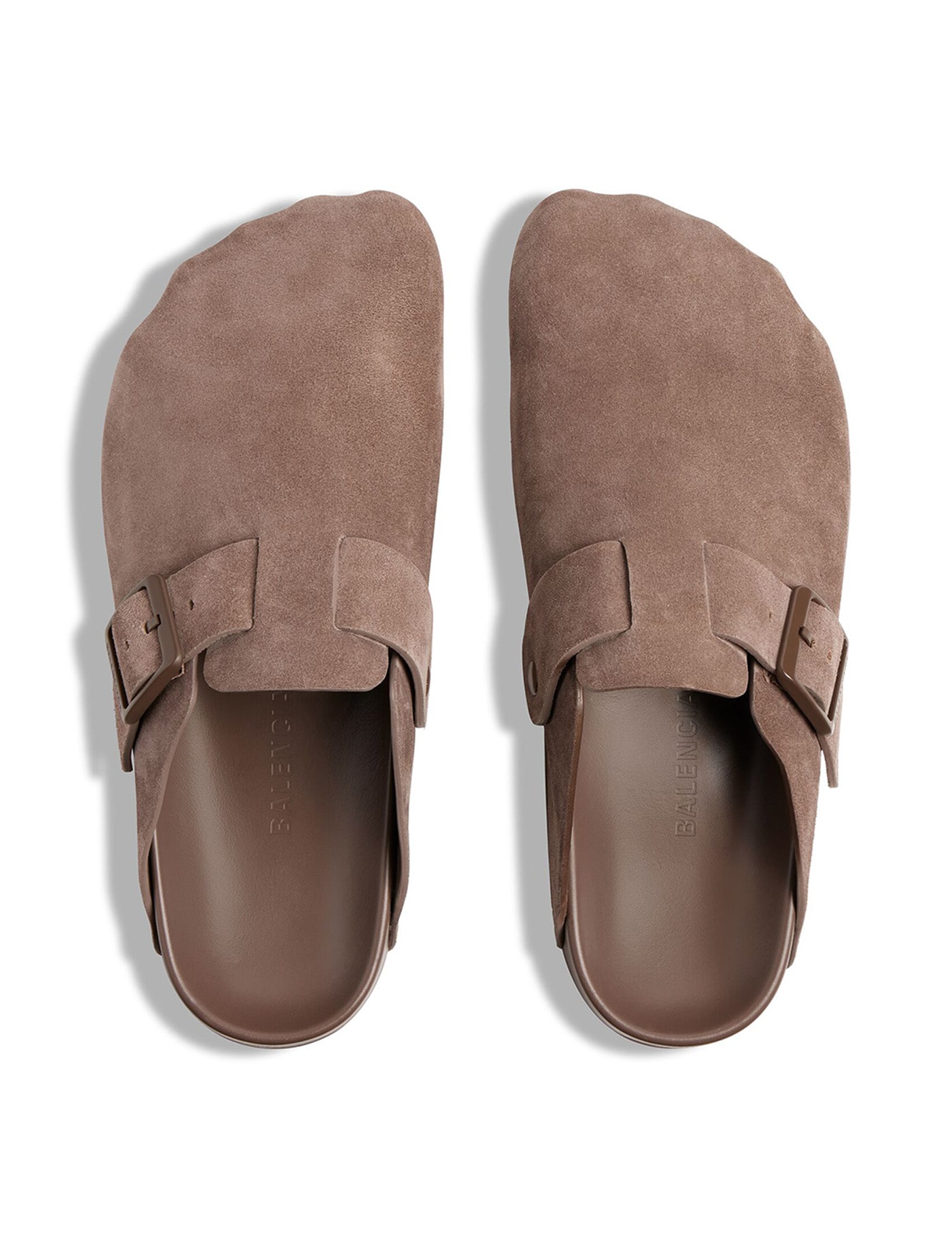 Sunday mules in light-brown suede with five finger shape on toe. They feature leather strap with adjustable buckle and rubber sole with Balenciaga logo.