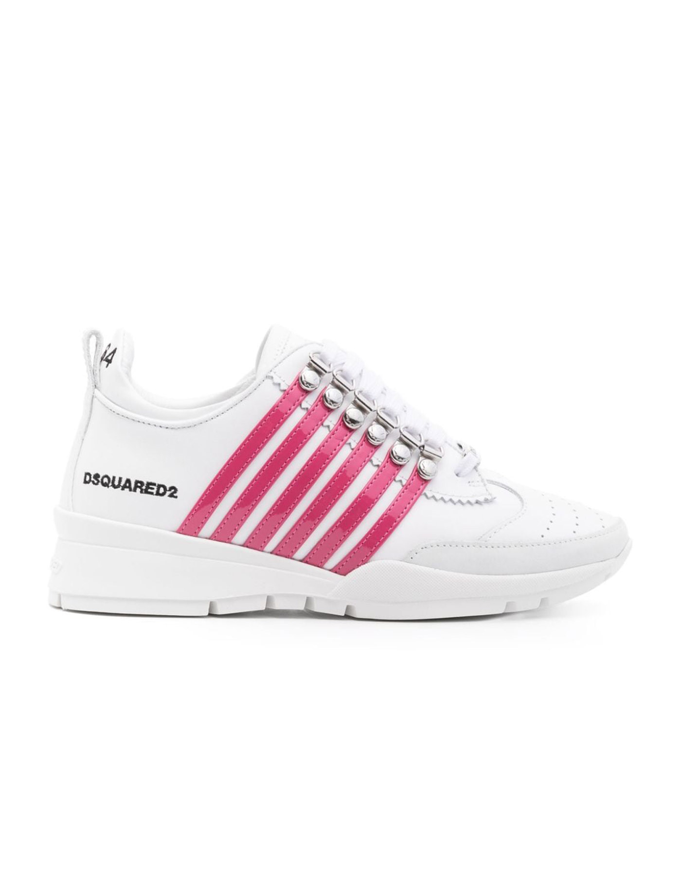 Dsquared2 Legendary sneaker made of white leather with fuchsia patent leather side bands. Embroidered logo in contrasting color on the side, metallic eyelets and white cotton laces. Leather lining and insole, rubber sole. Height 4 cm.