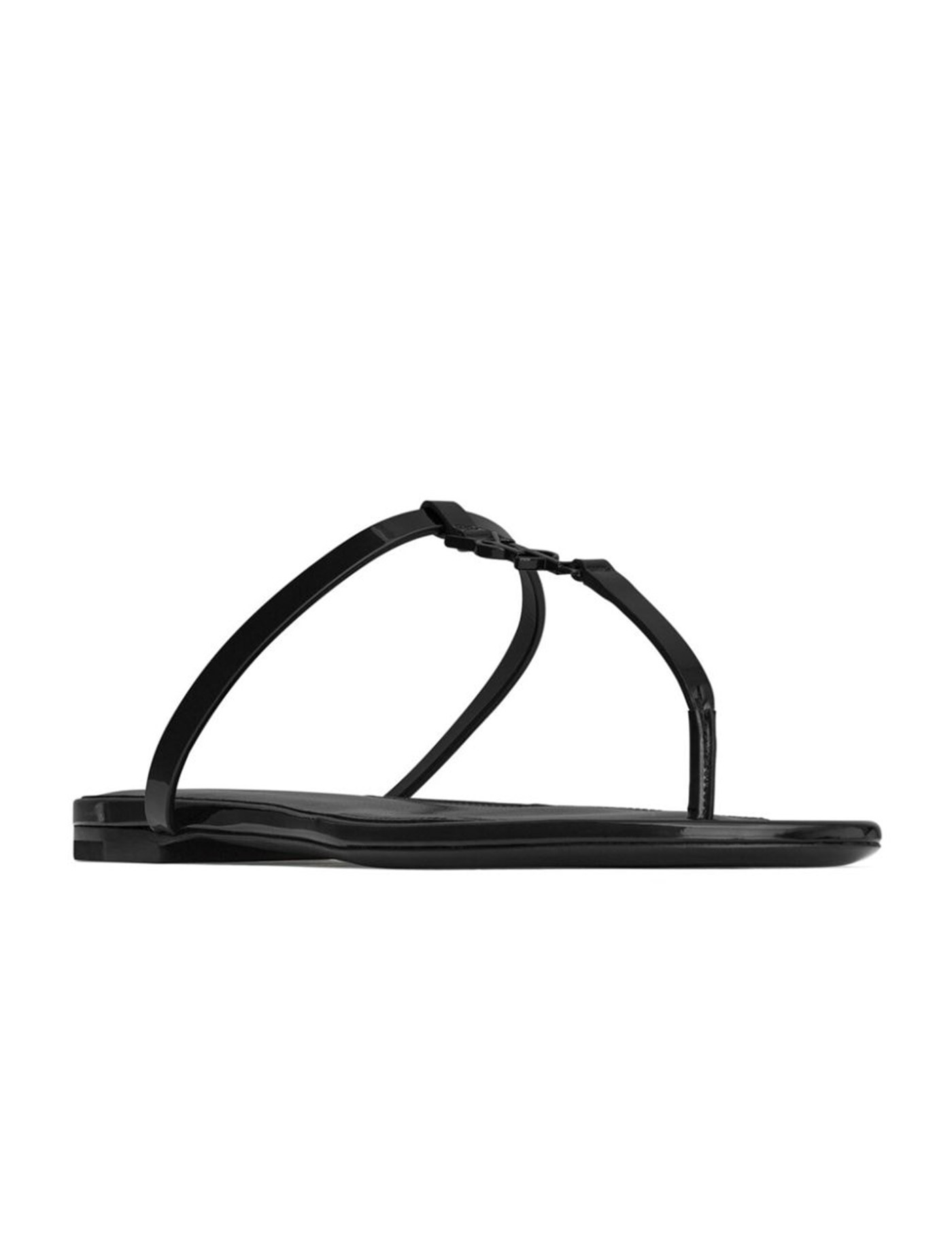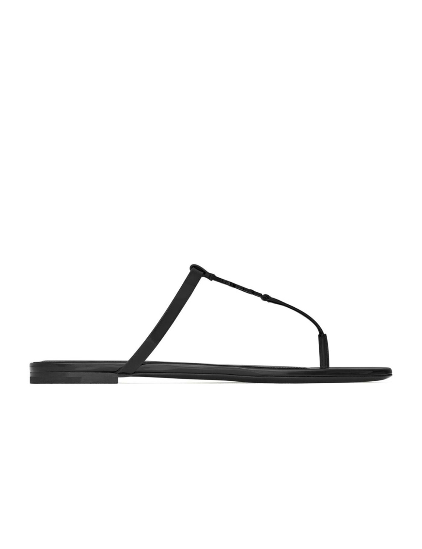 Cassandra slide sandals in black calfskin with T-strap arch band and black metal Cassandre on the front. Leather sole. Any leather imperfections are not to be considered manufacturing defects, but a peculiarity of the material.