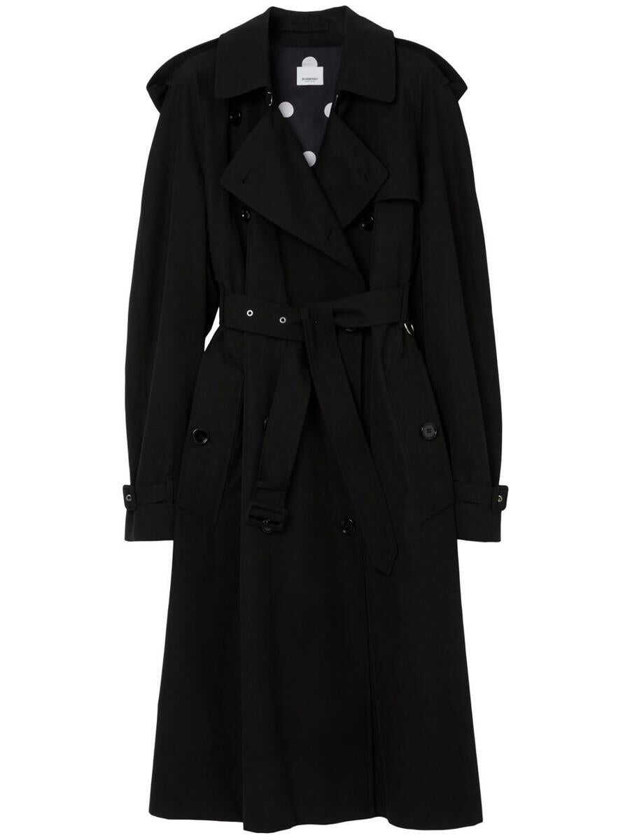 double-breasted trench coat from BURBERRY featuring black, cotton, two side welt pockets, tied waist, double-breasted button fastening, notched lapels, long sleeves, belted cuffs, central rear vent and below-knee length.