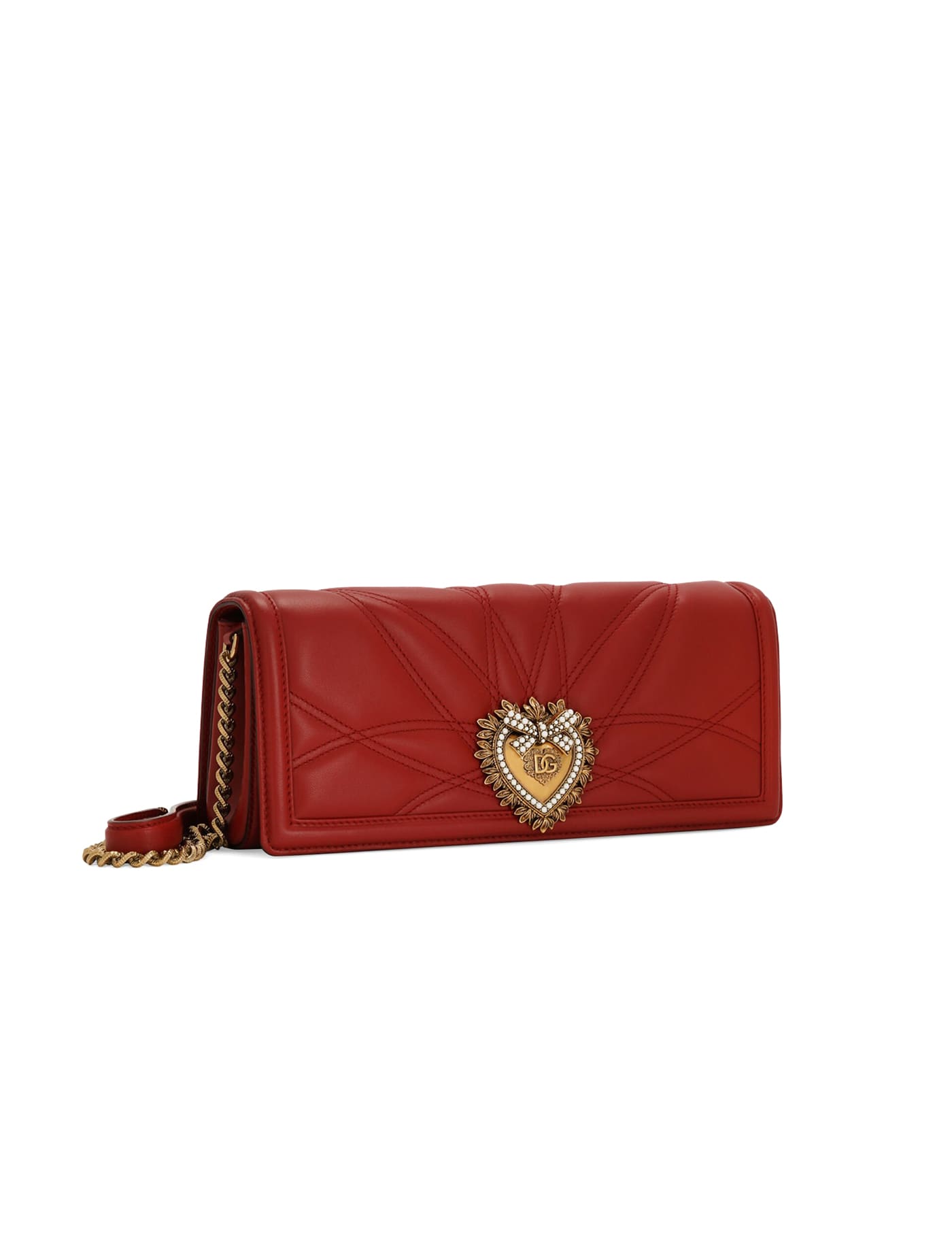 logo-plaque leather clutch bag from DOLCE & GABBANA featuring dark red, lambskin, matelassé effect, gold-tone hardware, gold-tone logo plaque, detachable chain-link shoulder strap, foldover top with magnetic fastening, internal slip pocket and internal zip-fastening pocket.